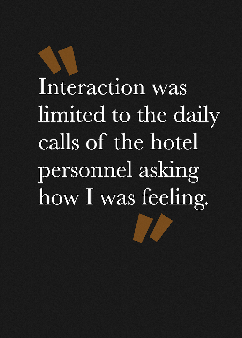 Being escorted to the room was my last in-person interaction with another human being for the duration of the quarantine. Steps were taken to ensure minimal exposure, such as leaving food and other items on a stool outside the door, and a fixed schedule for leaving towels and sheets, among others.