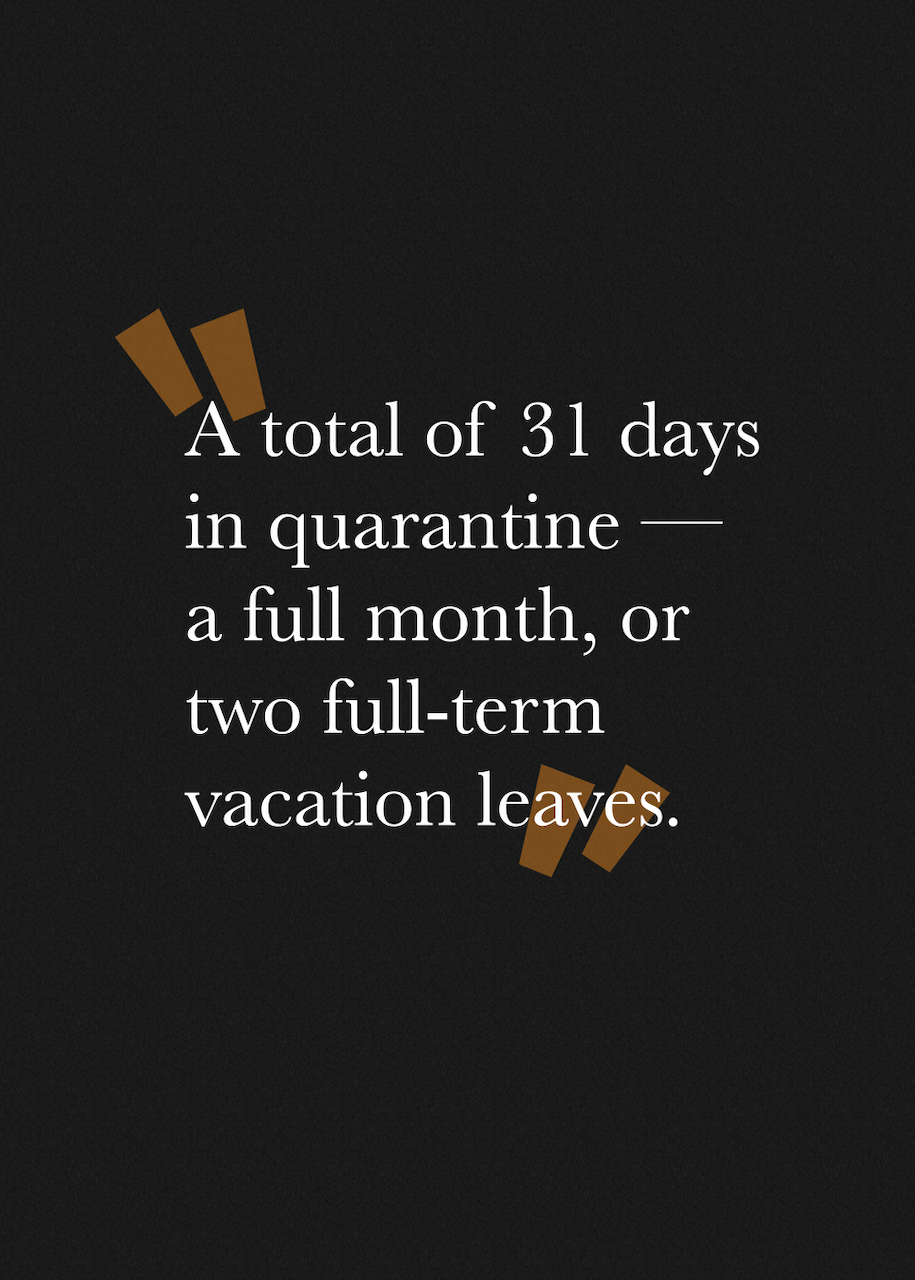 I spent a total of 31 days in quarantine. That is equivalent to a full month, or 8.5% of a whole year, or two annual full-term vacation leaves taken consecutively. Here I detail my experiences.