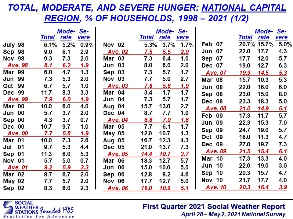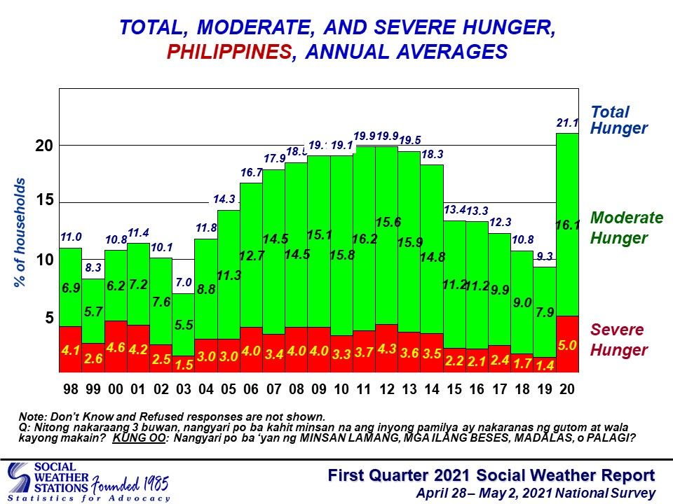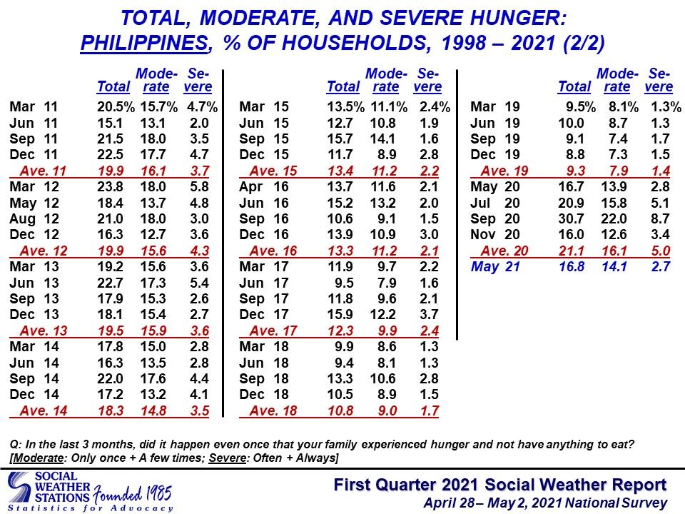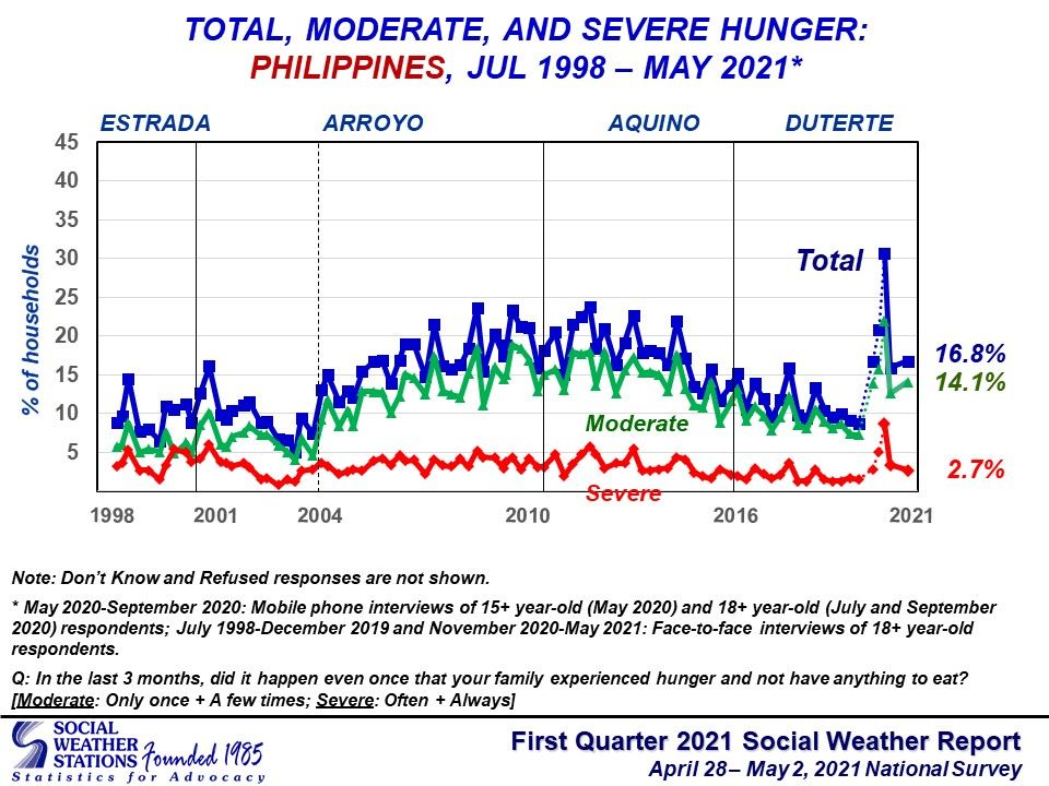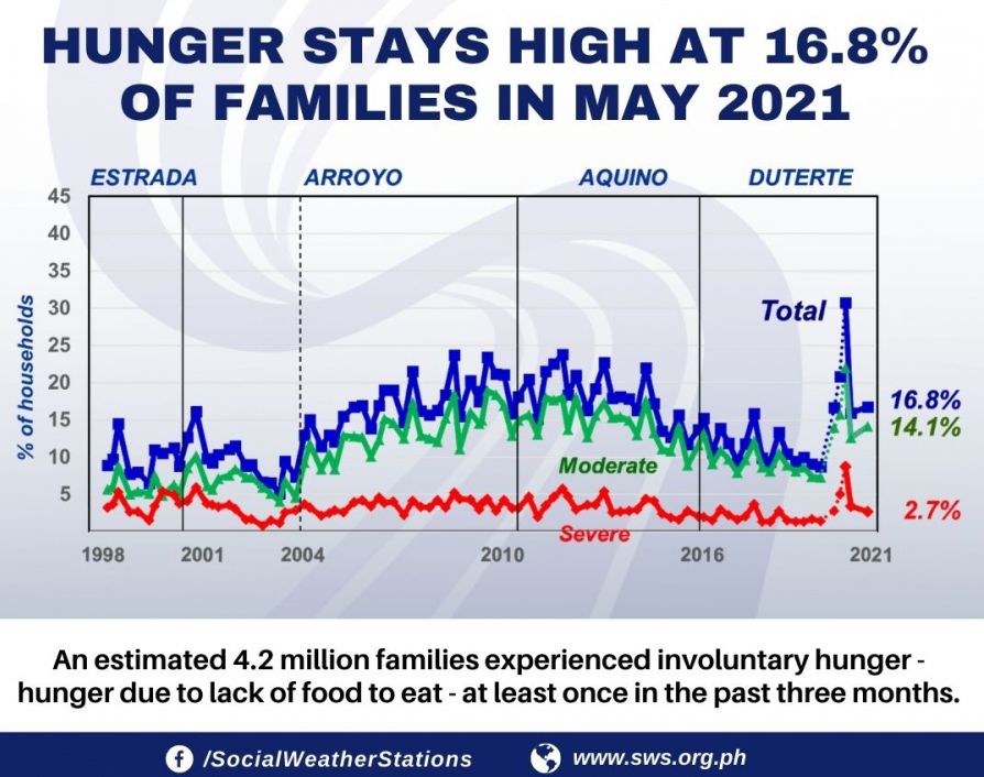The national Social Weather Survey of April 28-May 2, 2021 found that 16.8% or an estimated 4.2 million families experienced involuntary hunger – hunger due to lack of food to eat – at least once in the past three months.