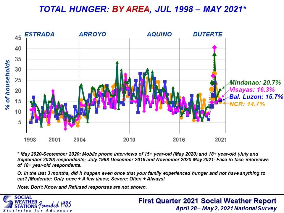 Hunger is 20.7% in Mindanao, 16.3% in the Visayas, 15.7% in Balance Luzon, and 14.7% in Metro Manila