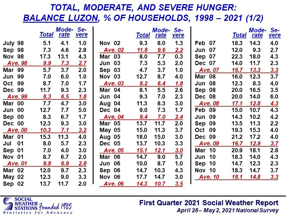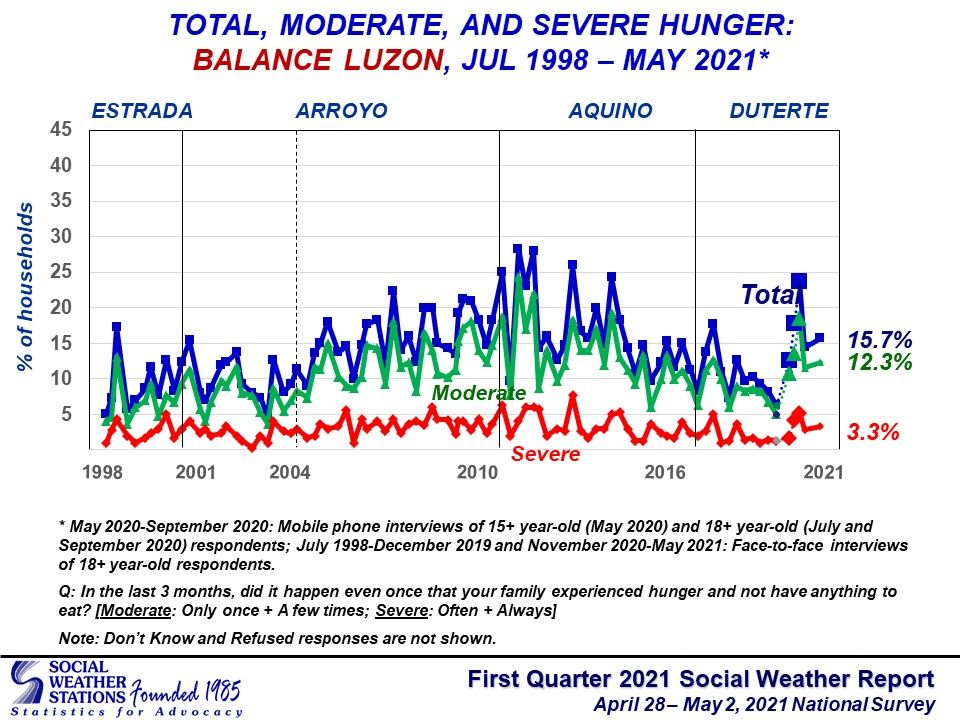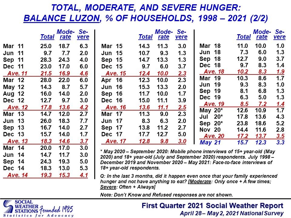 In Balance Luzon, Moderate Hunger and Severe Hunger are 12.3% and 3.3%, respectively, in May 2021 compared to 11.6% and 2.8% in November 2020.