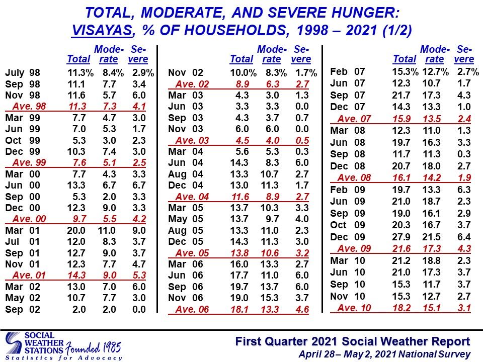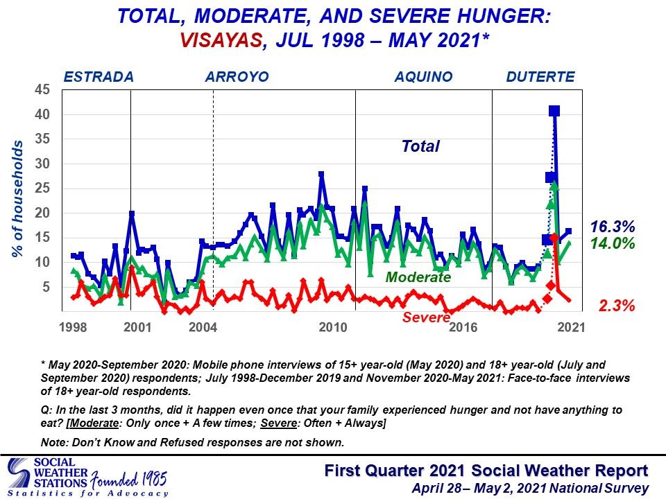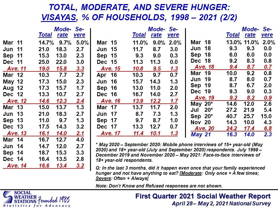 In the Visayas, Moderate Hunger and Severe Hunger are 14.0% and 2.3%, respectively, in May 2021 compared to 10.0% and 4.3% in November 2020.
