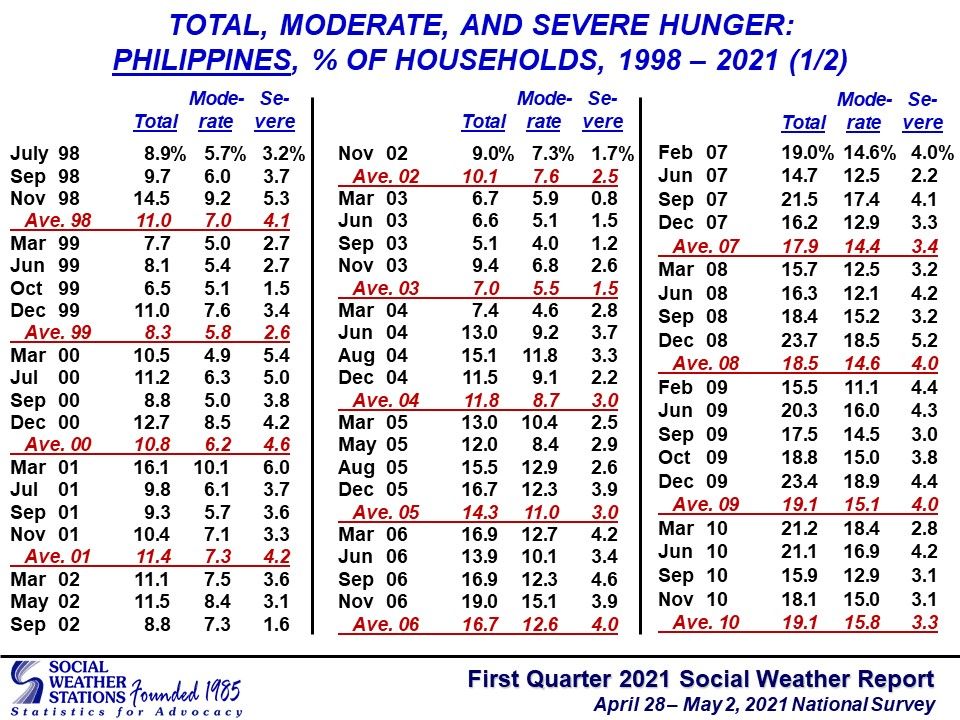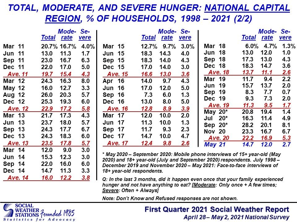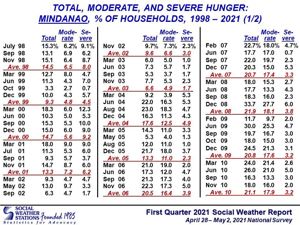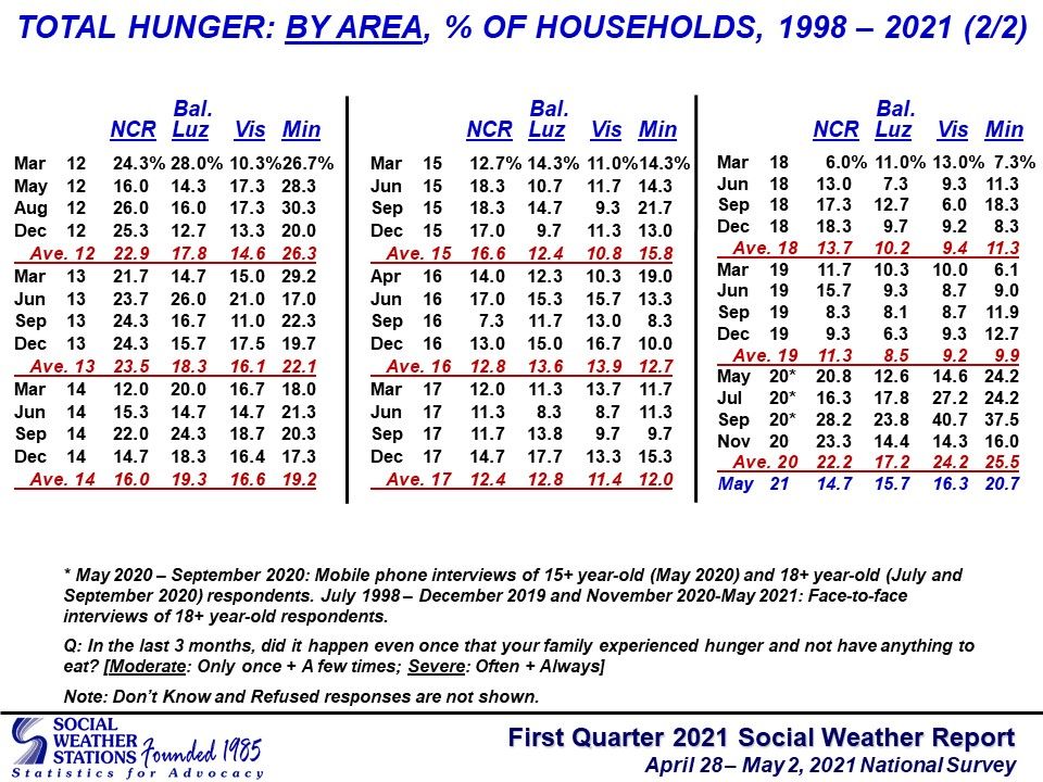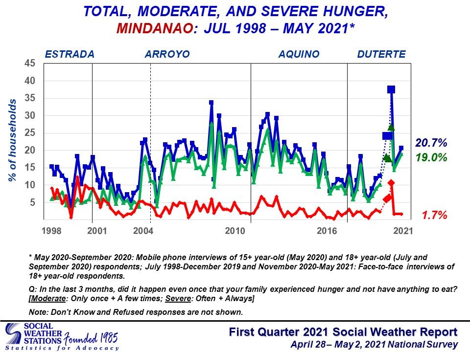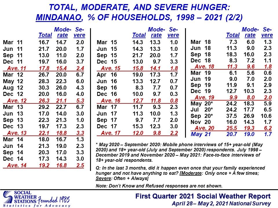 In Mindanao, Moderate Hunger and Severe Hunger are 19.0% and 1.7%, respectively, in May 2021 compared to 14.3% and 1.7% in November 2020.