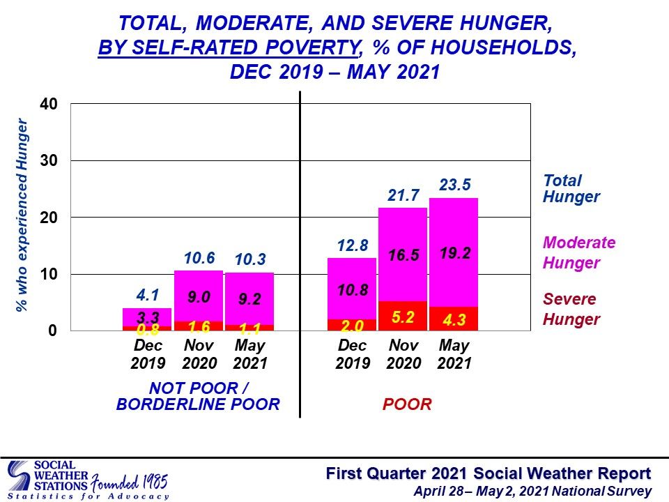 The May 2021 survey found 49% of families rating themselves as Poor, 33% feeling Borderline Poor, and only 17% feeling Not Poor. It also found 32% of families rating themselves as Food-Poor, 45% feeling Borderline Food-Poor, and 23% feeling Not Food-Poor (“First Quarter 2021 Social Weather Survey: Only 17% of Filipino families feel Not Poor; 49% feel Poor, 33% feel Borderline Poor,” 9 July 2021, www.sws.org.ph).