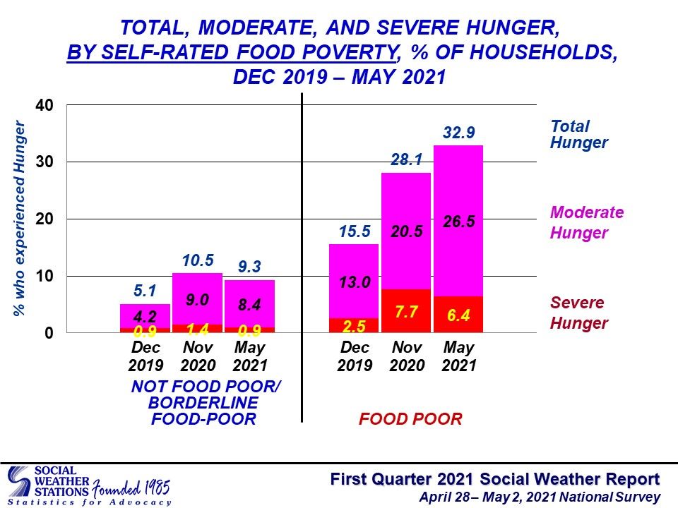 Overall Hunger also rose among the Self-Rated Food-Poor, up from 28.1% in November 2020 to 32.9% in May 2021. It declined by 1.2 points among the Non-Food-Poor [Not Food-Poor plus Borderline Food-Poor], from 10.5% to 9.3% [Chart 9].