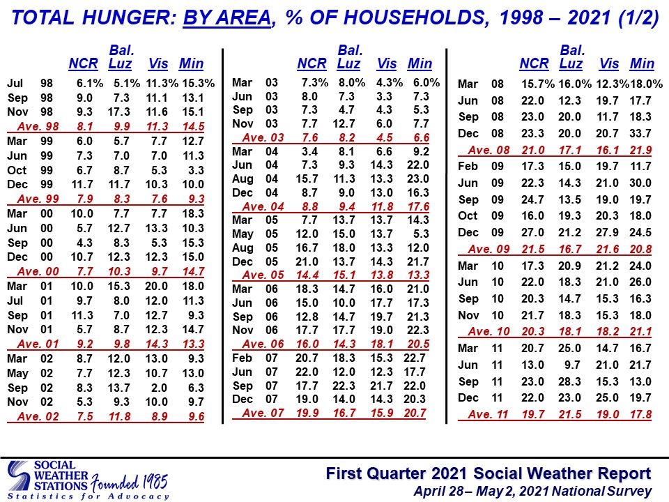 - Hunger is 20.7% in Mindanao, 16.3% in the Visayas, 15.7% in Balance Luzon, and 14.7% in Metro Manila
