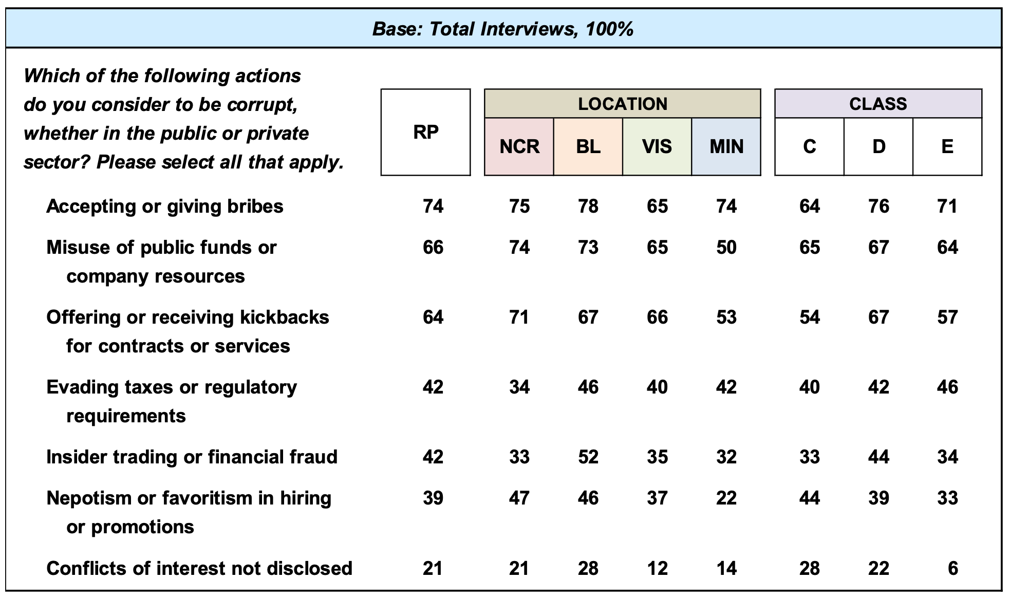 At the national level, the other public or private actions deemed as corrupt by Filipino adults are evading taxes or regulatory requirements (42%), insider trading or financial fraud (42%), nepotism or favoritism in hiring or promotions (39%), and non-disclosure of conflicts of interest (21%). Numerically speaking, the non-disclosure of conflicts of interest is the least often mentioned action across areas and classes (12% to 28% and 6% to 28%, respectively).
