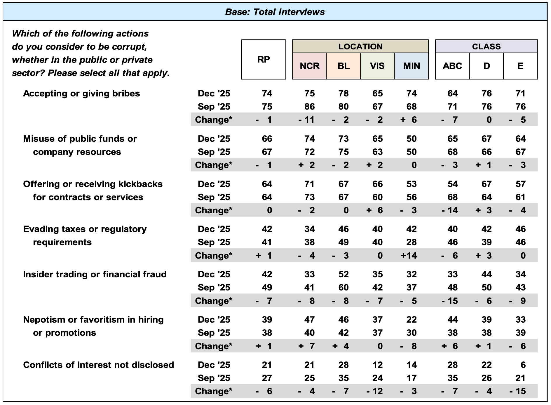 Between September 2025 and December 2025, the only significant overall changes are the decline in the percentages of those who consider either the non-disclosure of conflicts of interest (-6 percentage points) or insider trading or financial fraud (-7 percentage points) as corrupt acts. Across geographic and socioeconomic subgroupings, there is an increase in the percentage of Mindanawons who say tax evasion or non-compliance with regulatory requirements are corrupt acts (+14 percentage points) and the drop in the percentage of those who consider non-disclosure of conflicts of interest as a form of corruption (-12 percentage points) among Visayans. (Please refer to Table 2.)