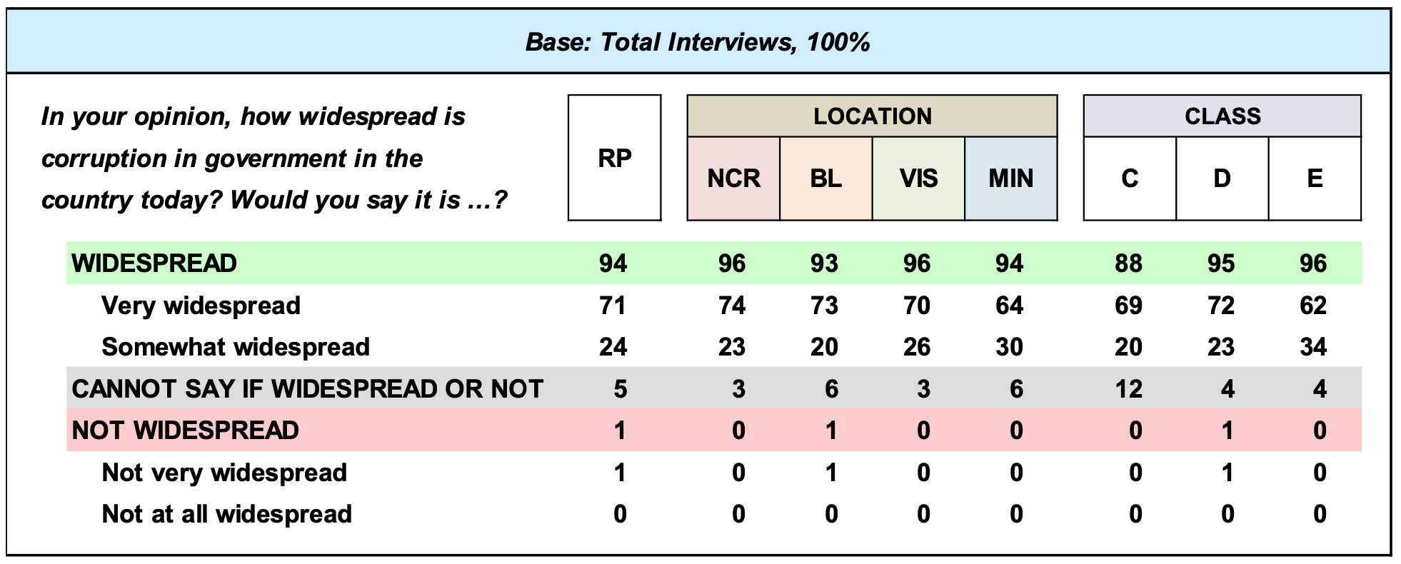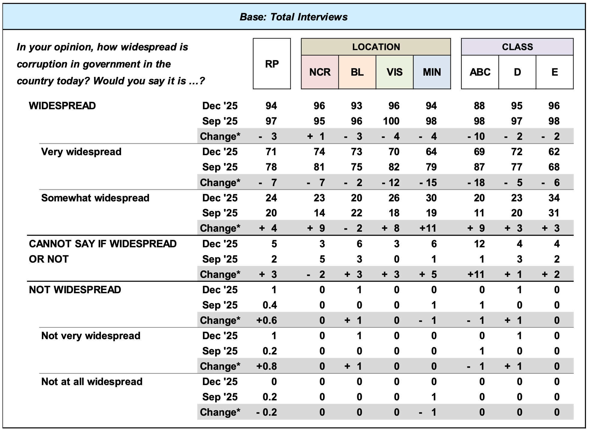Practically all Filipino adults say corruption in government is widespread (94%), with considerable to big majorities describing it as very widespread (71%); from September 2025 to December 2025, the percentage of those who consider corruption in Philippine government to be very widespread decreases (-7 percentage points)