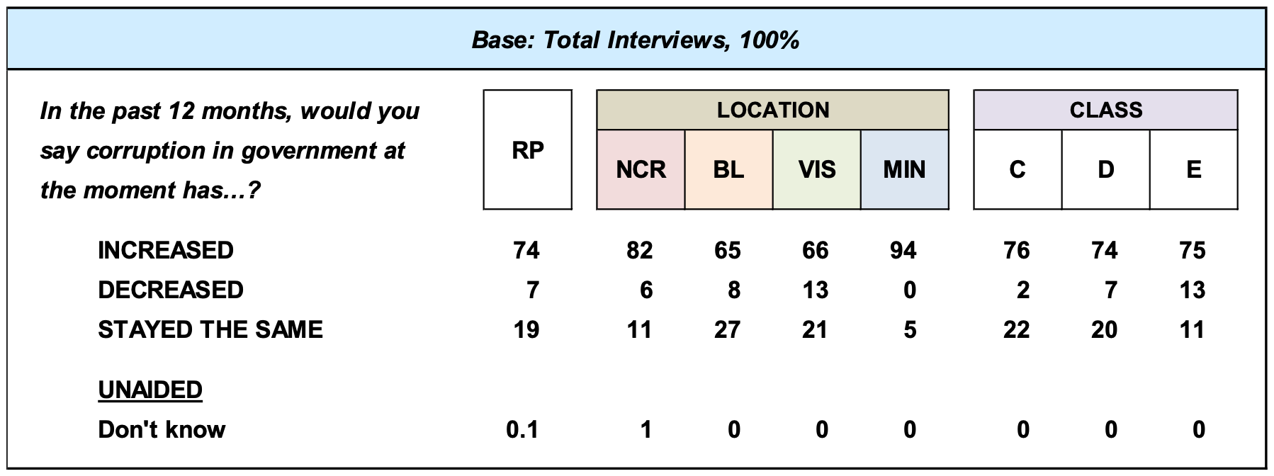 The prevailing opinion at the national level (74%) and in each area and class (65% to 94% and 74% to 76%, respectively) is that corruption in government has increased over the previous 12 months. A contrary view is expressed by 7% while 19% say there is no change in the extent of corruption in Philippine government during this period. (Please refer to Table 5.)