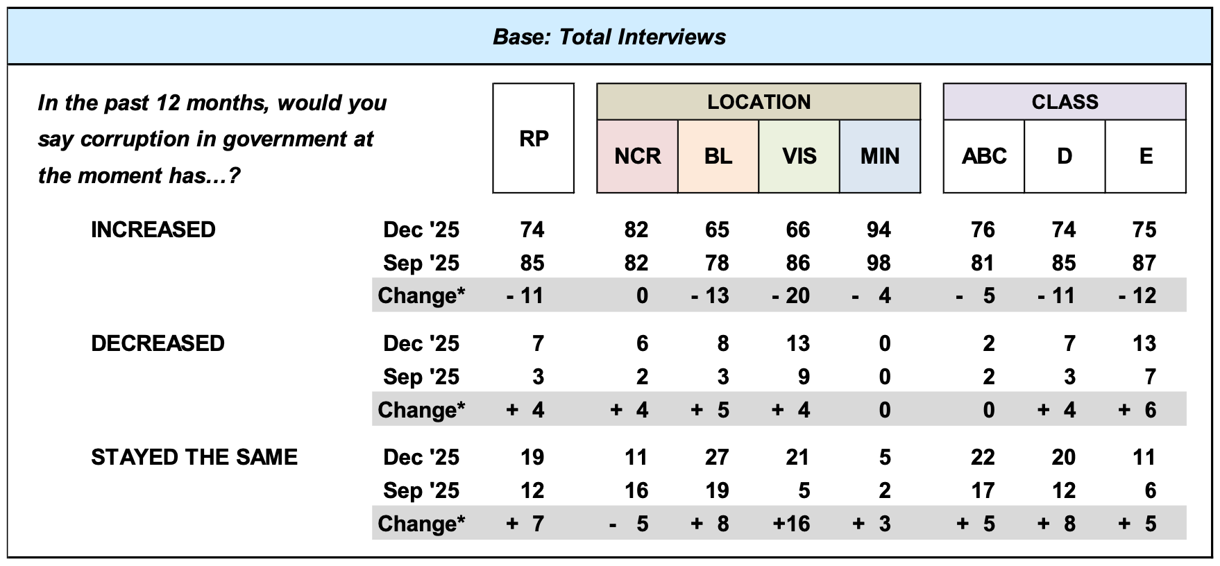 The view that corruption in Philippine government has increased in the past 12 months is shared by 74% of the adult population, lower than the September 2025 figure (85%)