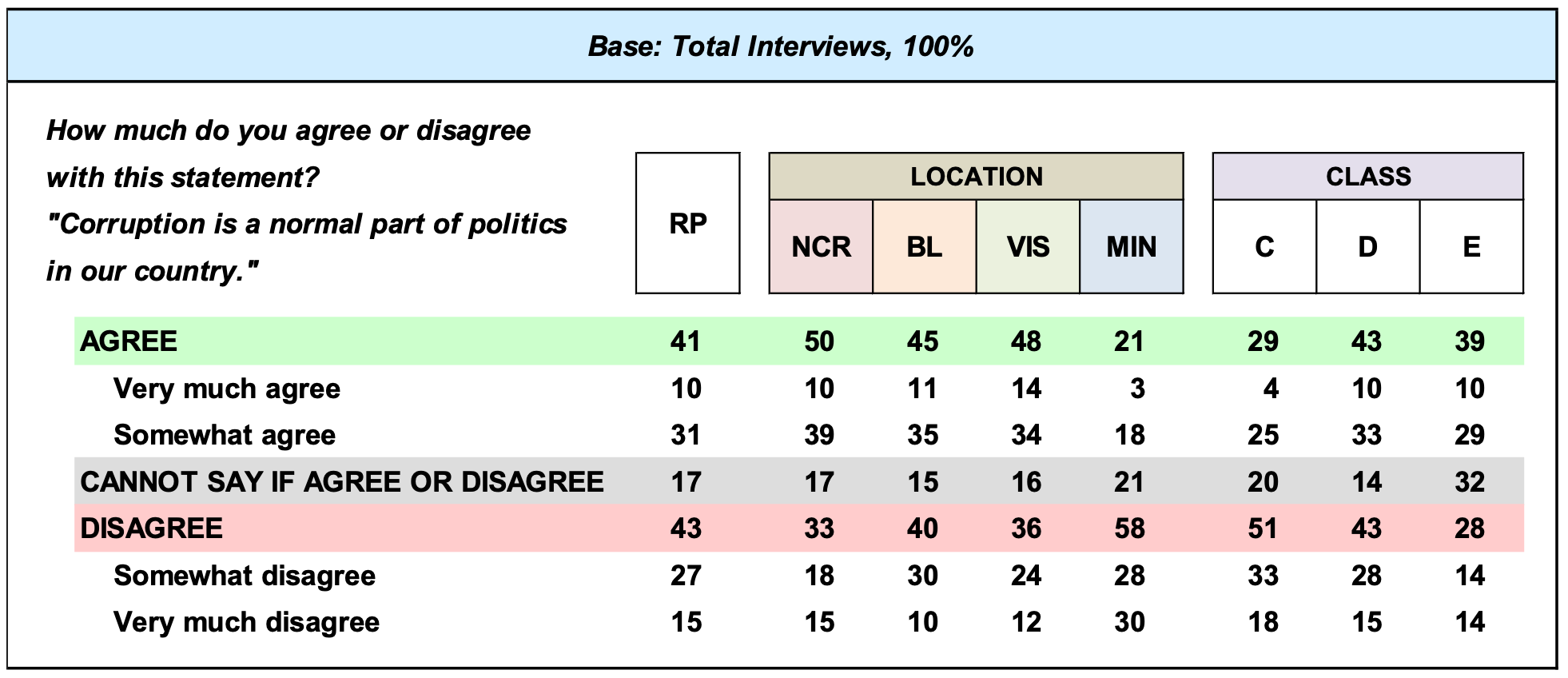 Virtually the same percentages of adults either agree or disagree with the view that corruption is a normal part of Philippine politics (41% versus 43%)