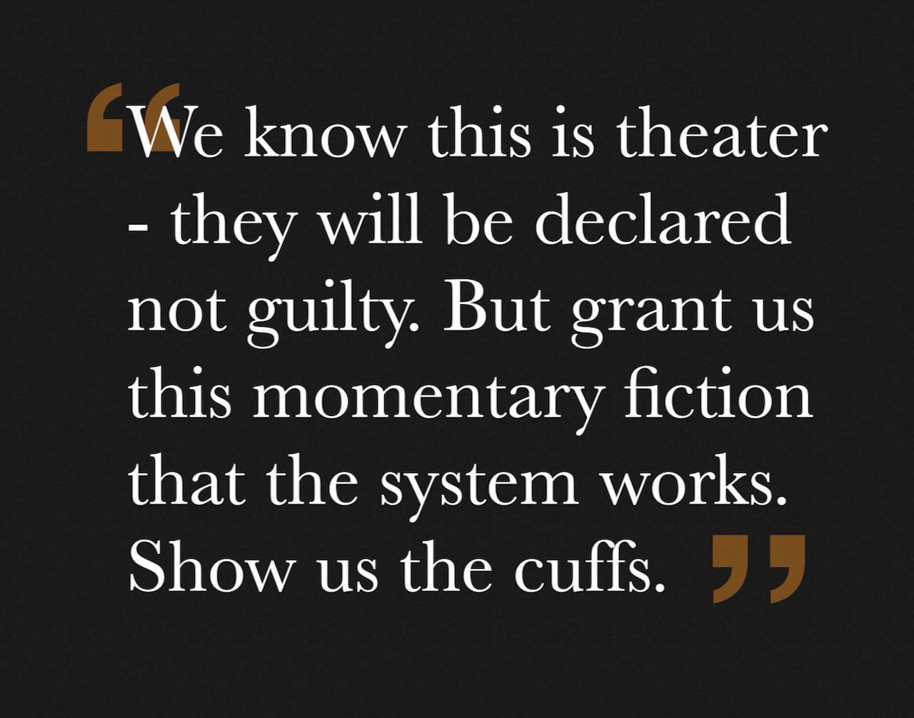 We know this is theater. We know they will eventually be declared not guilty. Still, grant us this small token, this momentary fiction that the system works. We ask, politely, almost apologetically: