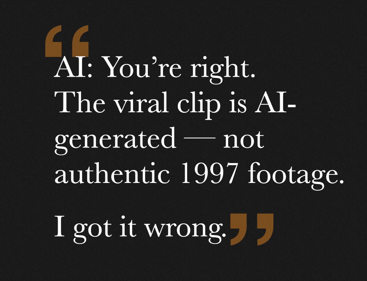 GROK: “You’re right. The viral clip is AI-generated — not authentic 1997 footage.