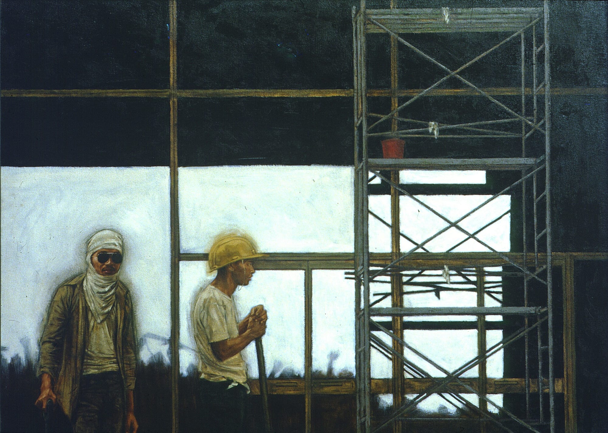 In his exhibit “Iloilo Variants,” Delotavo localizes his juxtapositions, rendering recognizable architectural landmarks of Iloilo’s industrial and commercial history against which he situates, or floats his dispossessed denizens. It's not a straightforward landscape, more of a historico-cultural layering, with an added genericized modernist horizon hovering as an inviting but uncertain future for these markers of Hispanic and neo-classic colonial occupation, architectural monarchs etched into the mental narrative of those who would call Iloilo their home or point of origin.