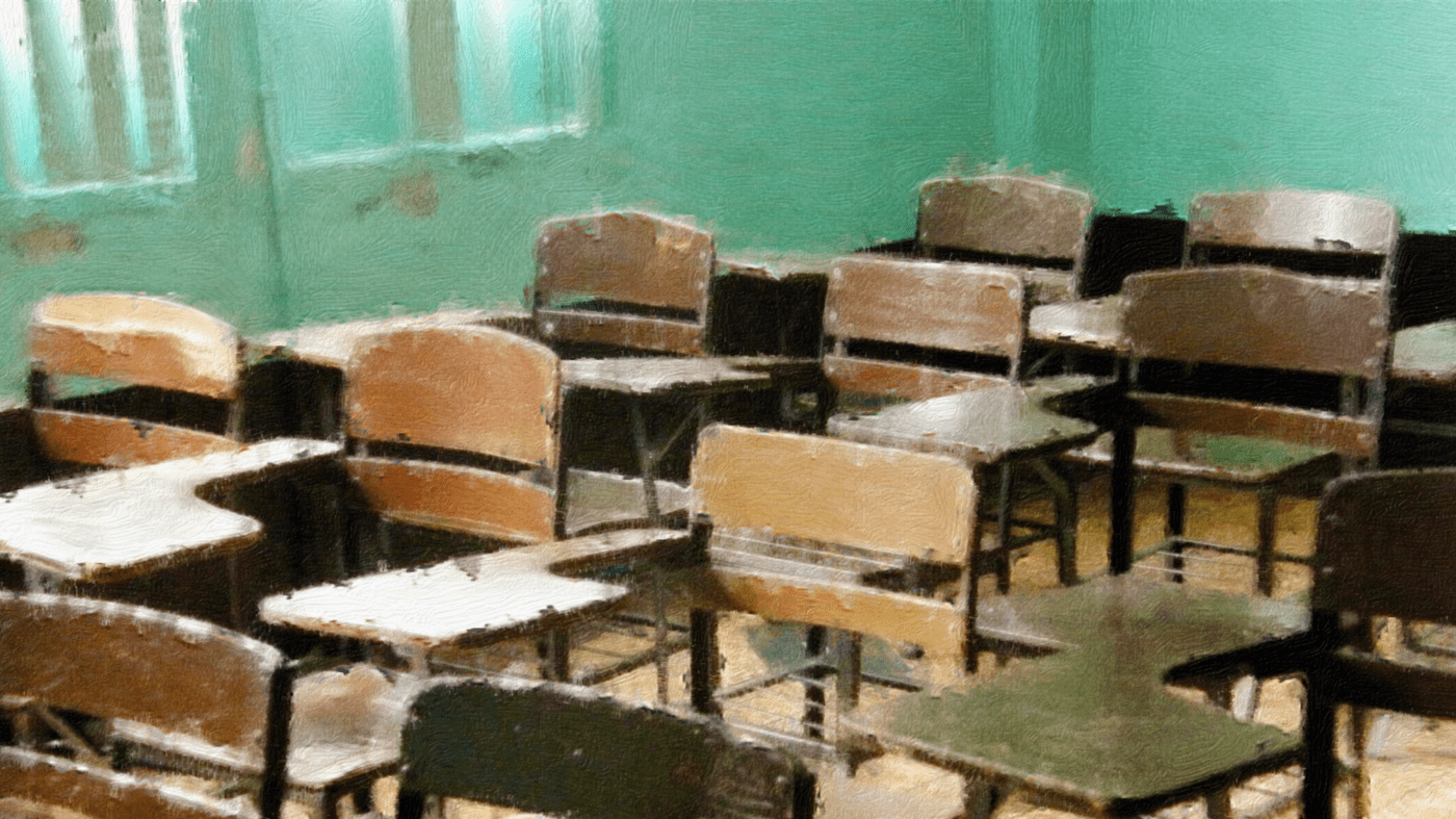 on wooden desks scored deep with the words