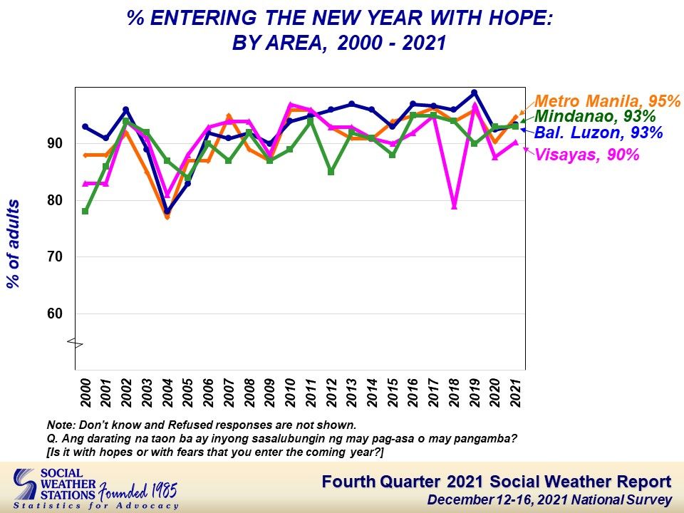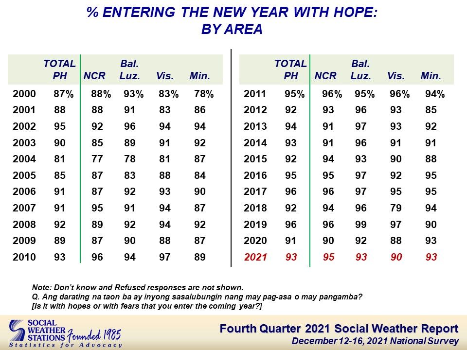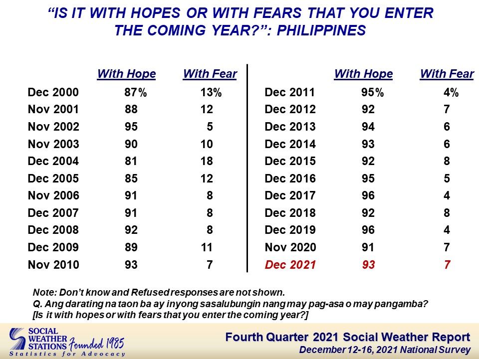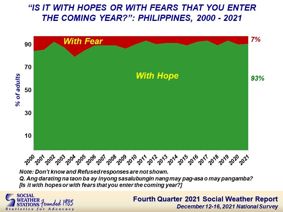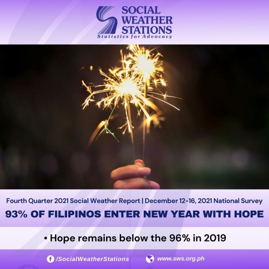 The national Social Weather Survey December 12-16, 2021, found 93% of adult Filipinos entering the New Year with hope rather than with fear.