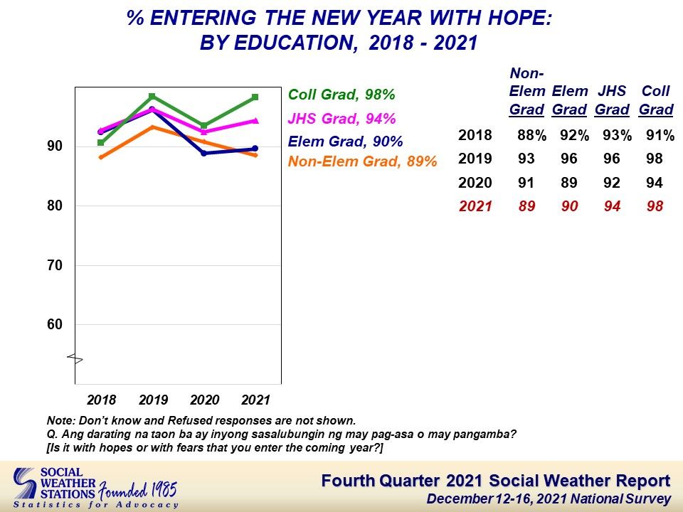 Compared to the end of 2020, New Year hope rose among elementary graduates (from 89% to 90%), among junior high school graduates (from 92% to 94%), and among college graduates (from 94% to 98%) [Chart 4].