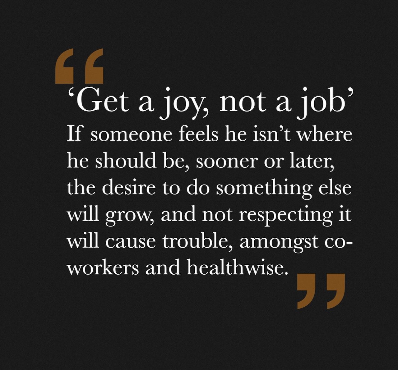 Koyang: I made this slogan which I repeat often, "Get a joy, not a job". If someone feels he isn't where he should be, sooner or later, the predilection or desire to do something else will grow, and not respecting it will cause trouble to co-workers and to his health.