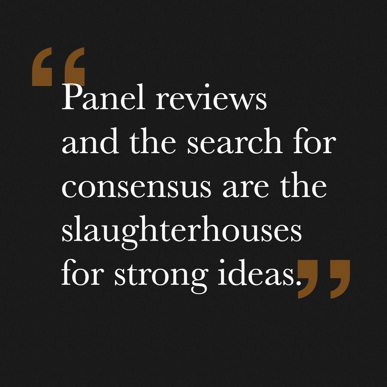 The aberrant idea, in its infancy, when still unshaped, untempered, is easy to snuff out. Think of it as an eaglet, vulnerable to other birds of prey, needing protection and tending. Best to stay the hand, let the idea breathe, give it a chance, and do not try for consensus. Reviews and search for consensus are the slaughterhouses for strong ideas.