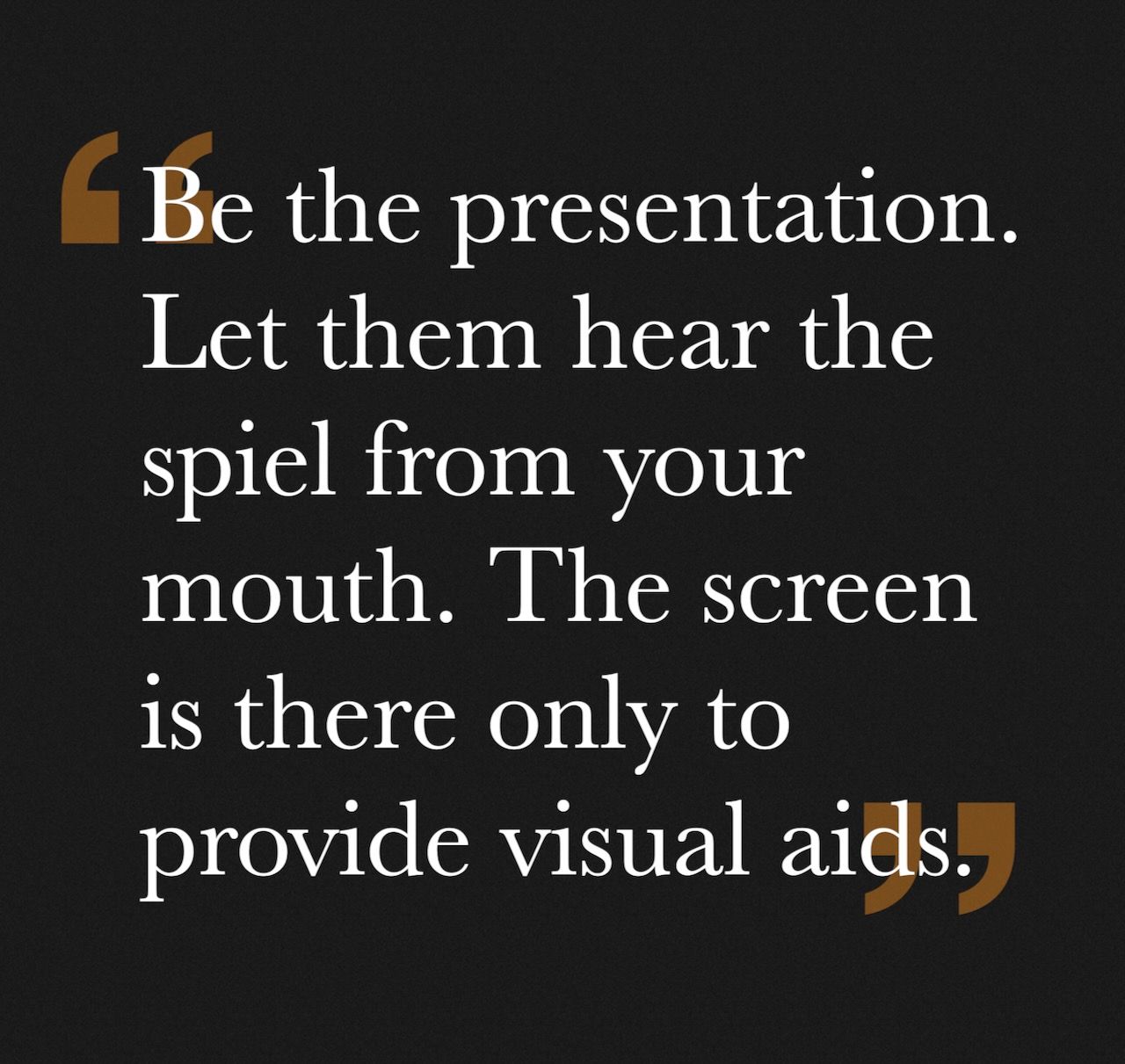 Do not rely on what is on the screen. Be the presentation. Let them hear the spiel from your mouth. The screen is there only to provide visual aids.