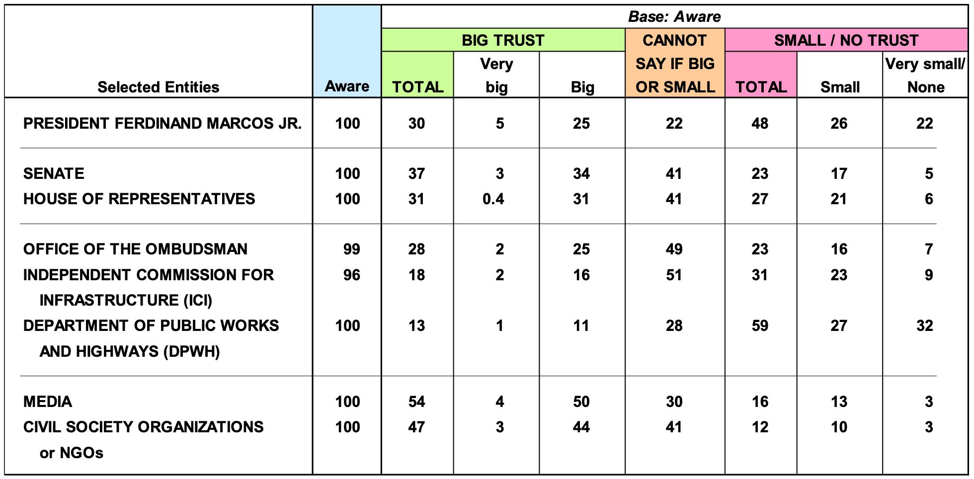 Among selected entities, a small majority of adults in the country (54%) identify the media as the one they trust to be able to address the problem of ghost or substandard flood control projects. A near majority (47%) expresses the same sentiment toward civil society organizations (CSOs) or non-governmental organizations (NGOs). In contrast, near to small majorities do not trust the President (48%) and the Department of Public Works and Highways (59%) to deal with the matter while big pluralities to bare majorities cannot say if they trust or distrust the House of Representatives (41%), the Office of the Ombudsman (49%), and the Independent Commission for Infrastructure (51%). In the case of the Senate, about the same percentages of adults are either ambivalent on the matter of trusting or distrusting the legislative body’s capability to address the flood control projects issue (41%) or trust it to be able to handle the matter (37%). (Please refer to Table 1.)