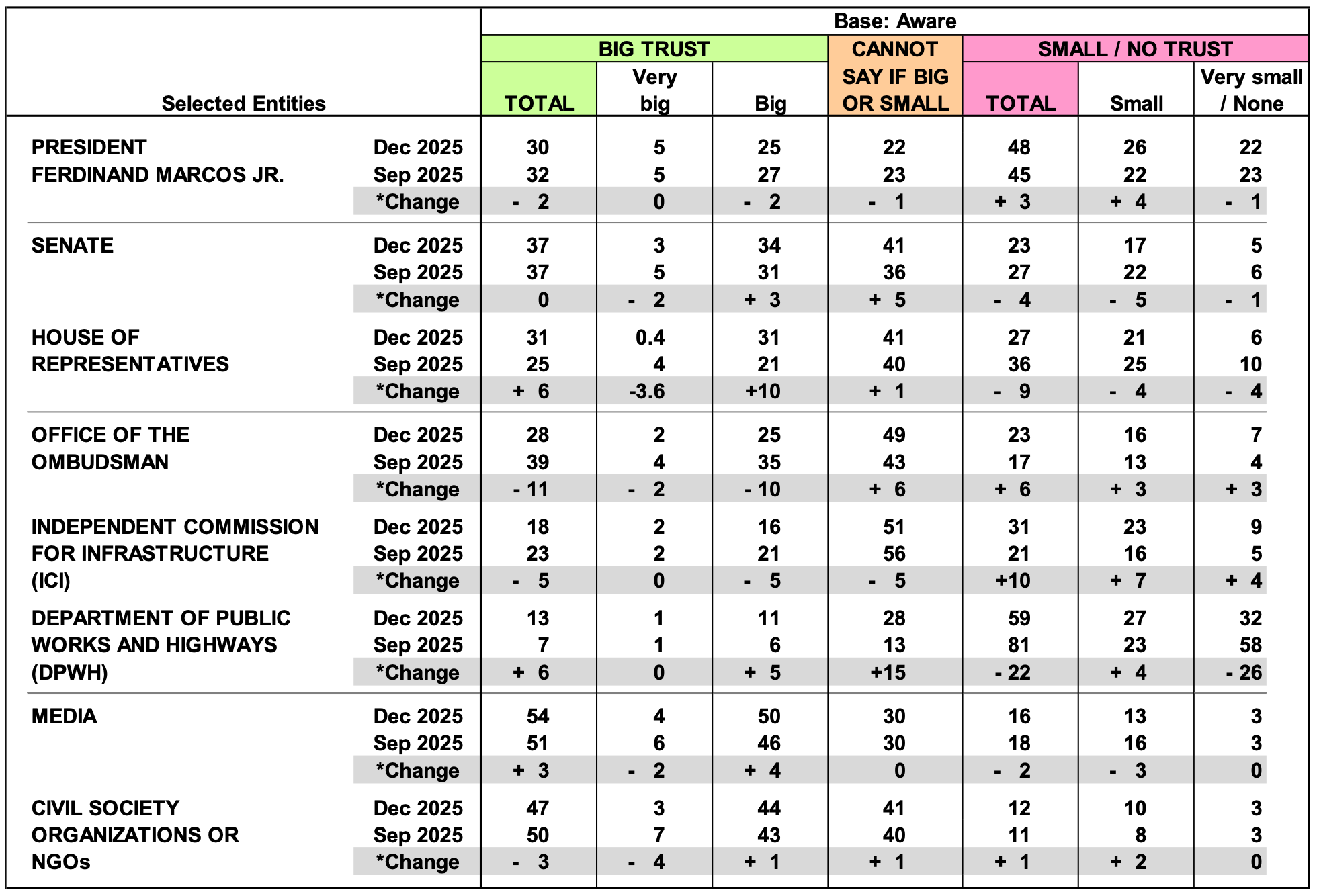 Several notable movements occur between September 2025 and December 2025. While there is an increase in the level of trustworthiness of the House of Representatives (+6 percentage points), distrust in the legislative chamber eases (-9 percentage points). Similarly, trust in the Department of Public Works and Highways becomes more notable (+6 percentage points) and distrust in the agency becomes less pronounced (-22 percentage points). Furthermore, the level of ambivalence regarding the agency’s trustworthiness in relation to its capability to deal with the flood control projects scandal goes up during this period (+15 percentage points). (Please refer to Table 2.)