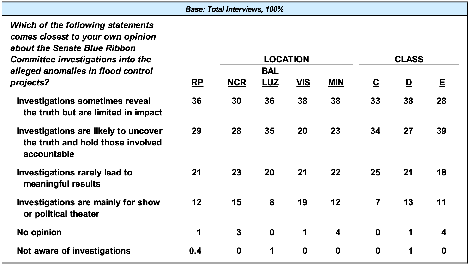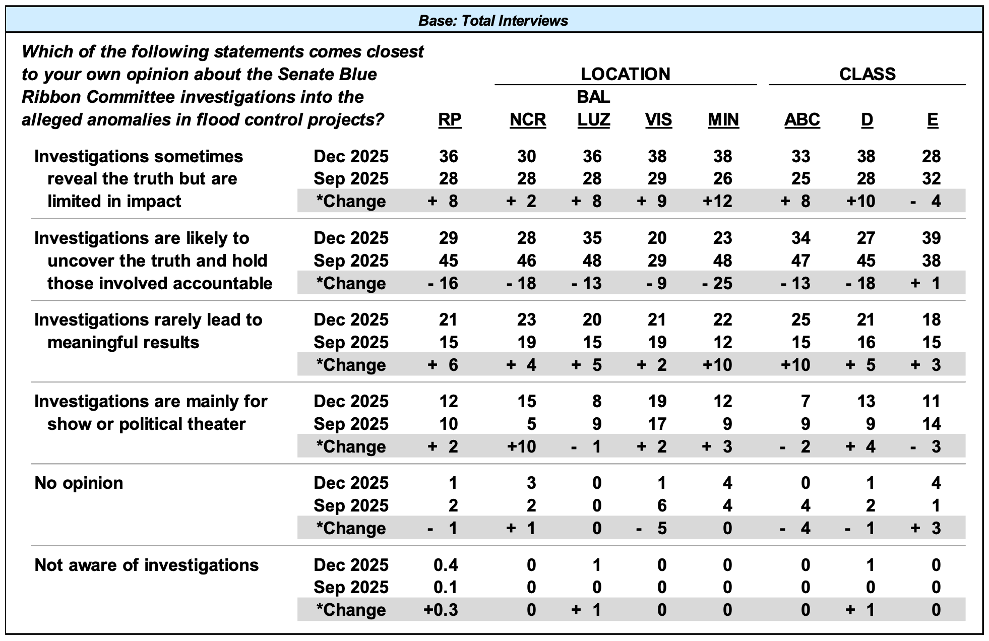 For about a third of the adult population (36%), investigations such as those being conducted by the Senate Blue Ribbon Committee regarding anomalous flood control projects sometimes reveal the truth but have limited impact; agreement with this view becomes more marked from September 2025 to December 2025 (+8 percentage points)