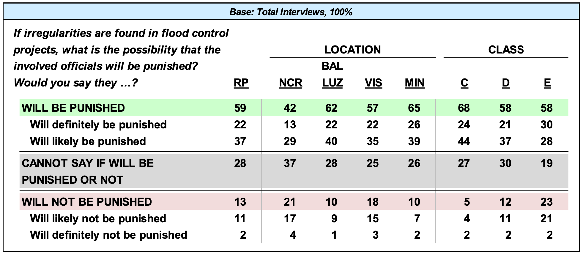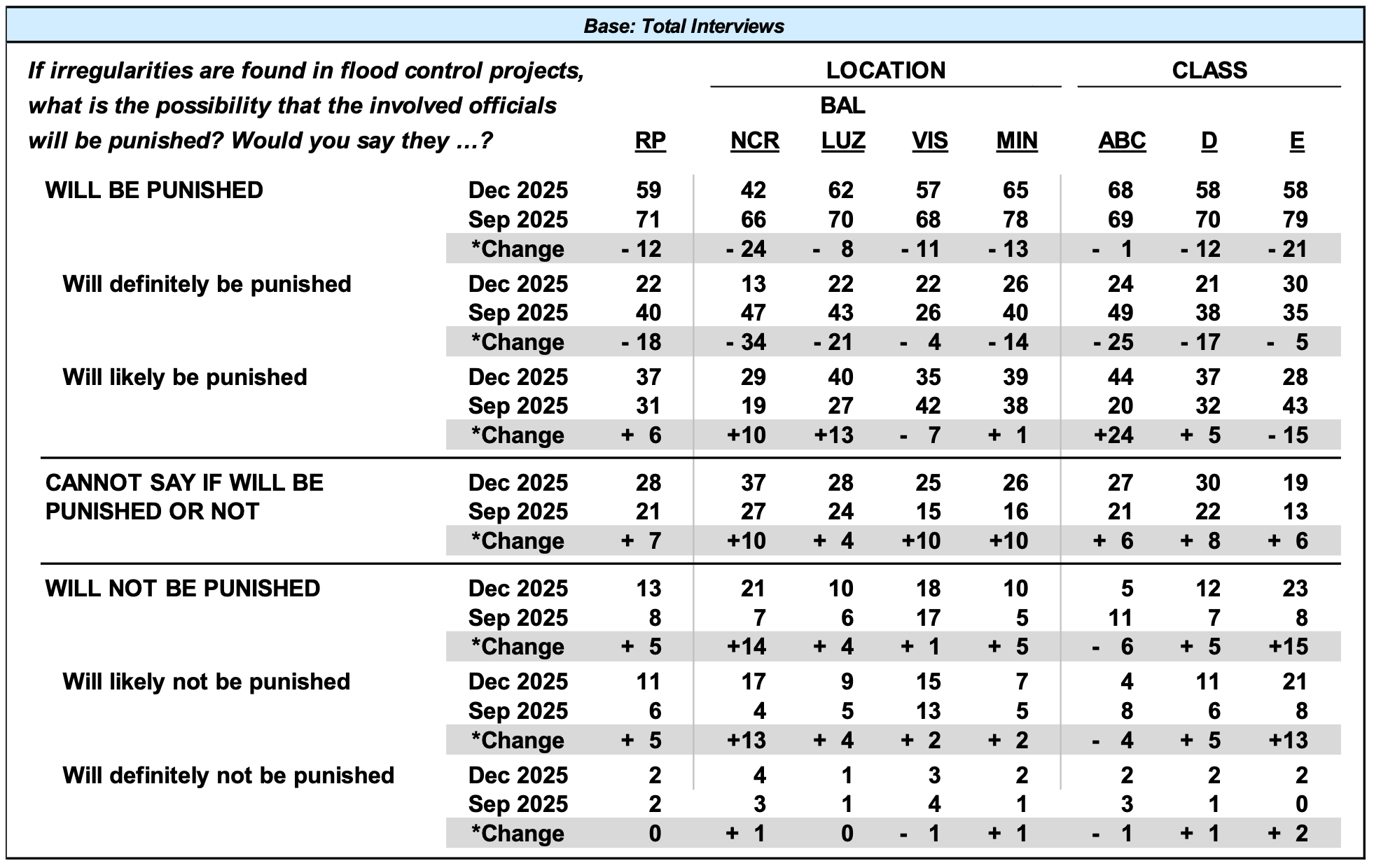 Majorities at the national level (59%) as well as across most areas and all classes (57% to 65% and 58% to 68%, respectively) continue to believe that government officials found guilty in connection with the flood control projects issue will be punished. An exception is Metro Manila where almost the same percentages either agree with this opinion (42%) or express indecision on the matter (37%). Agreement with this view eases between September 2025 and December 2025 not only in the Philippines (-12 percentage points) but also in Metro Manila (-24 percentage points), Mindanao (-13 percentage points), Class D (-12 percentage points), and Class E (-21 percentage points). (Please refer to Tables 5 to 6.)