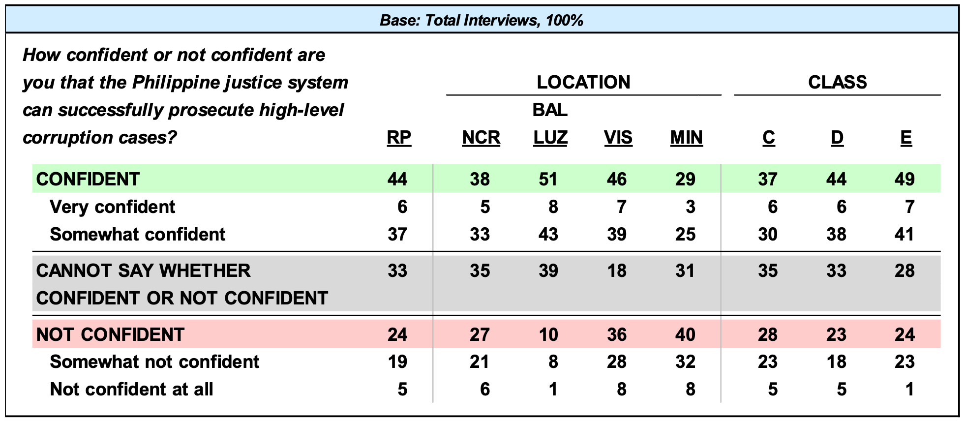 For 44% of Filipino adults, the Philippine justice system can successfully prosecute highlevel corruption cases – a view held by big pluralities to bare majorities in the rest of Luzon (51%), Class D (44%), and Class E (49%). Indecision on the matter is expressed by a third of the adult population (33%) while around a quarter (24%) is not confident about the ability of the country’s justice system to do so. Nearly the same percentages of Visayans are either confident or not confident that the Philippine justice system can successfully prosecute high-level corruption cases (46% versus 36%). Public opinion on the matter is split three (3) ways in Metro Manila, Mindanao, and Class C (29% to 38% confident, 31% to 35% undecided, and 27% to 40% not confident). (Please refer to Table 7.)