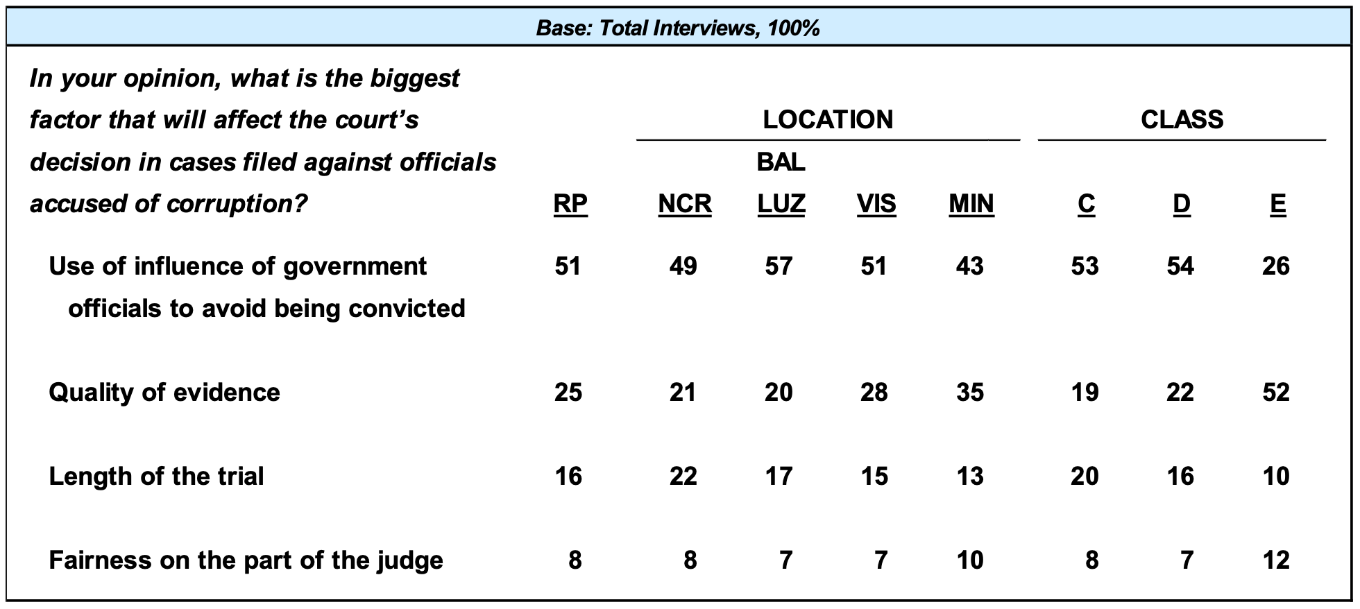 The primary factor that will affect court decisions regarding cases involving corrupt government officials is the use of influence of such officials to avoid being convicted. This opinion is expressed by near to small majorities in the Philippines (51%), Metro Manila (49%), the rest of Luzon (57%), Visayas (51%), Class C (53%), and Class D (54%). For a small majority in Class E (52%), the biggest factor is the quality of evidence presented against corrupt government officials, a sentiment shared by a quarter of Filipino adults (25%). In Mindanao, around the same percentages identify either the use of influence of government officials to avoid conviction (43%) or the quality of evidence presented against these officials (35%) as the biggest factor that will affect court decisions in cases against those accused of corruption. Overall, the other factors cited by Filipino adults are the length of the trial of corruption cases (16%) and the fairness of judges handling these cases (8%). (Please refer to Table 8.)