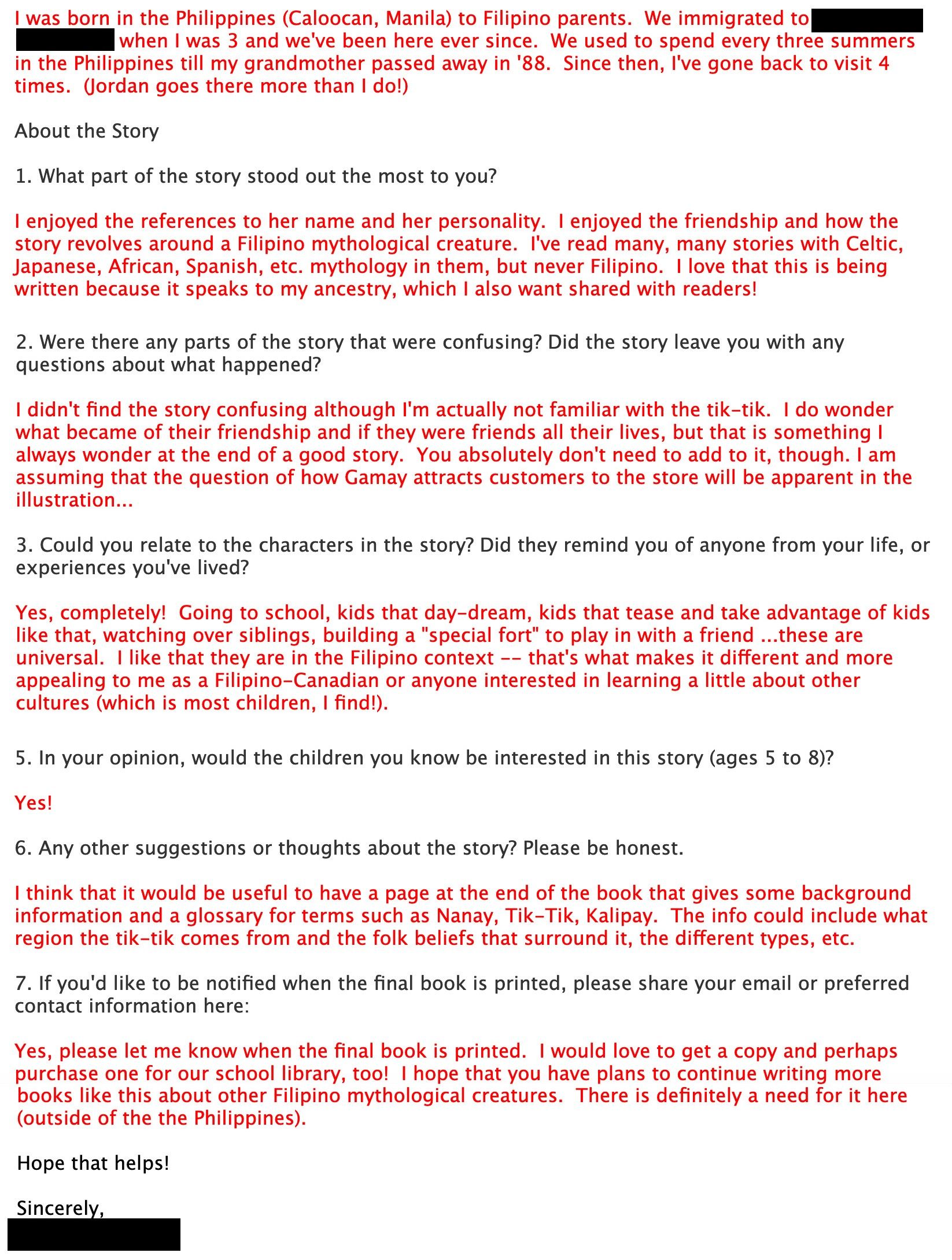 Knowing his wife was Filipina Canadian and a mom, I asked if I could interview her by email. I had a questionnaire to assess attitudes towards my book with diaspora Filipino parents. Jordan put me in touch with her (Interview excerpted here. Any identifying info is blocked out, to protect her privacy.)