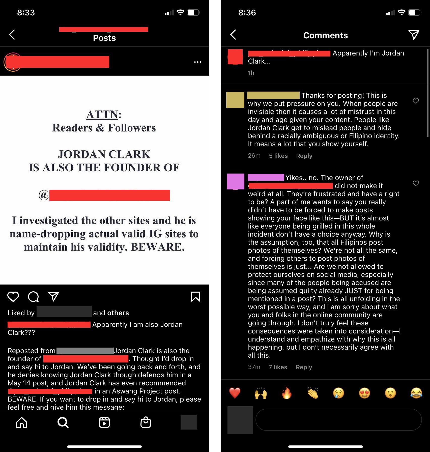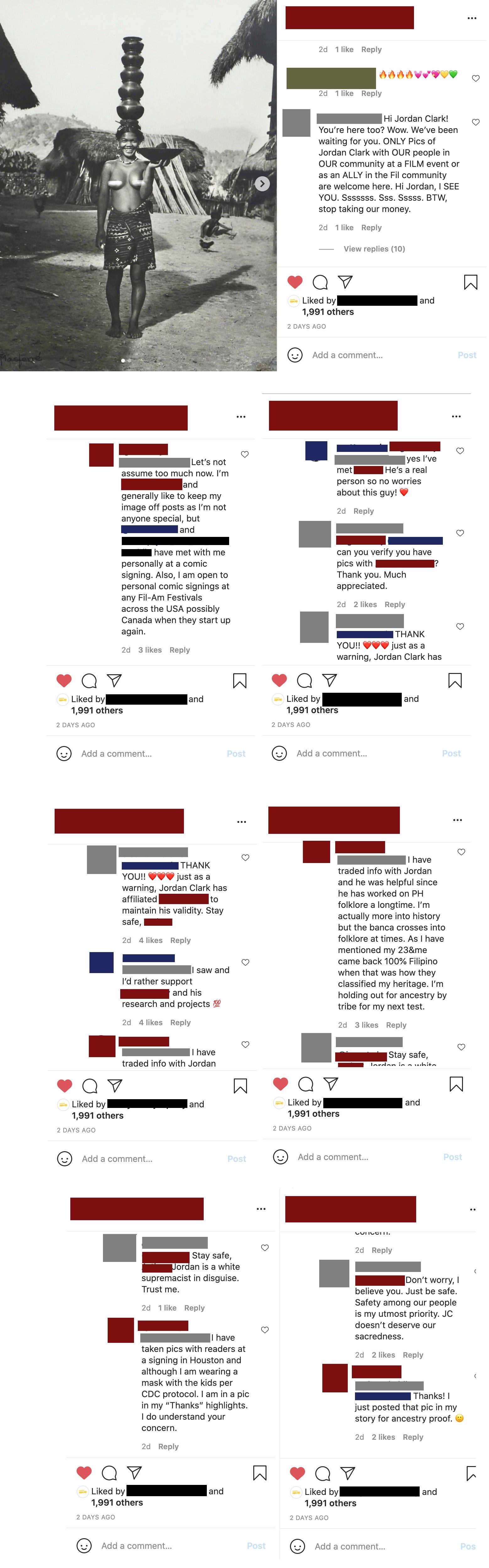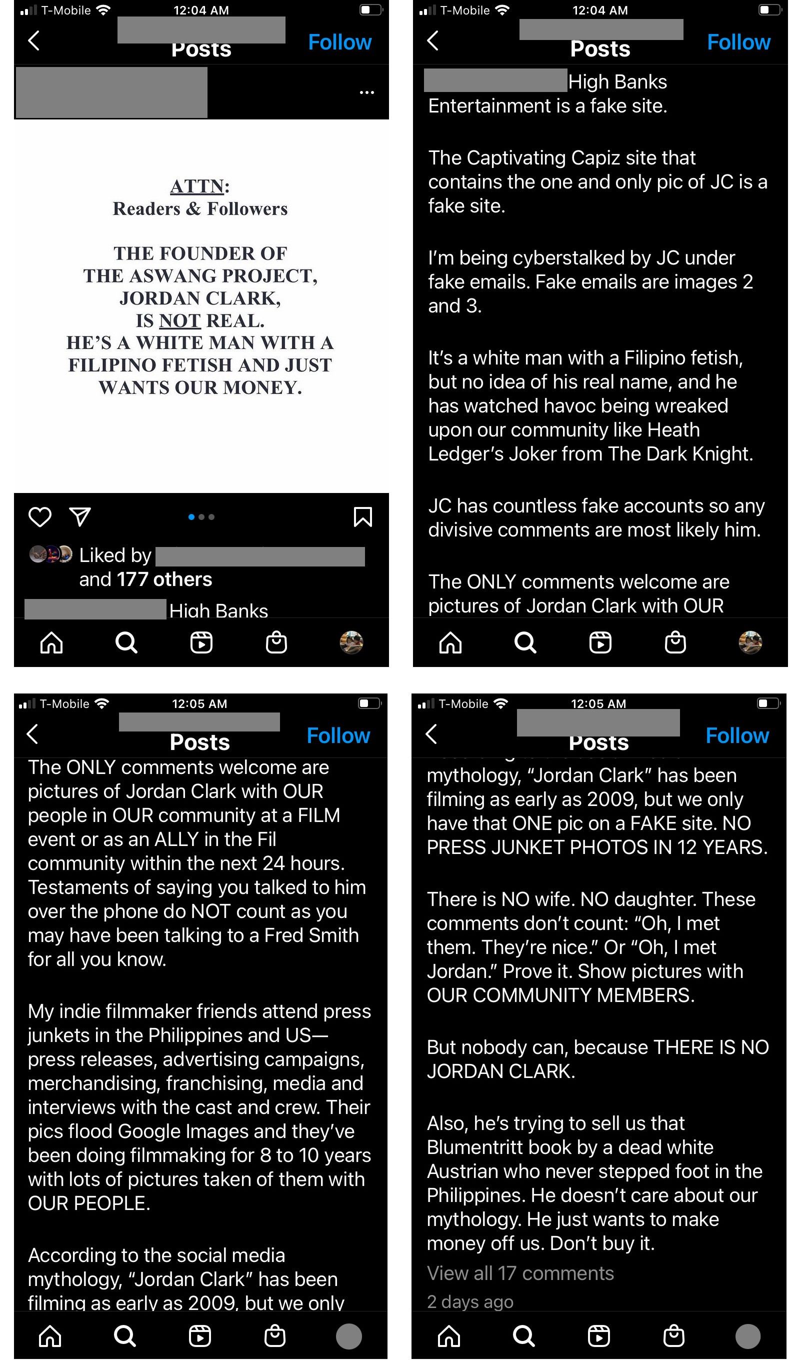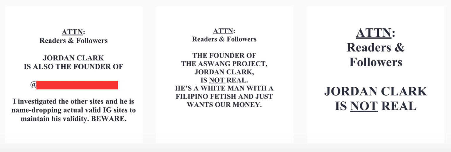 This is one of several posts like this over 3 days. An escalating demand for Jordan to produce photos of himself. At the end, the author, the graphic artist, and their supporters began harassing Philippine culture / community Instagram accounts that Aswang Project had recommended, accusing them of being Jordan Clark in disguise and demanding the account admins show their faces. They pressured two accounts into producing photos.