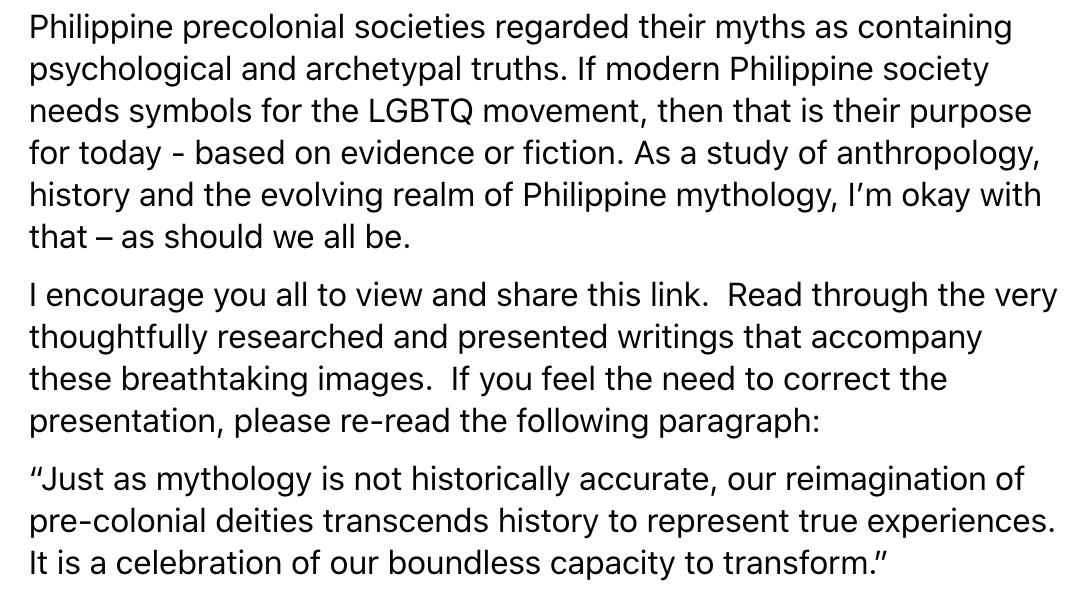 I wish this had gone a different way, that people had approached Jordan to talk it through, instead of blasting him on social media. Maybe it’s a lot to ask, to put that much trust through a computer screen. It’s just, based on what he wrote when sharing the work of queer artists this past February on TAP’s platforms, it seemed like he was putting the spotlight on trans identities and the queering of Philippine myths. It was acknowledging how the artists are resolving the tension between historical frameworks and modern queer identity, it sounded like he was celebrating the beauty of their work and scholarship: