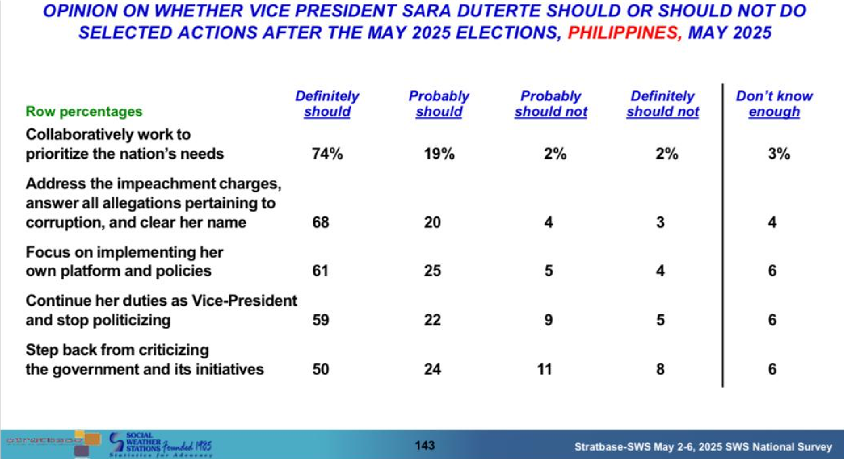 86% of the respondents would like Duterte to focus on implementing her own platforms and policies, 81% would want to continue her duties and stop politicizing, and 74% prefer her to stop criticizing the government and its initiatives.