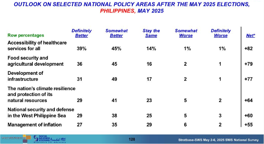 Other top concerns that Filipinos expect to address are the development of infrastructure (80%), climate resilience and protection of natural resources (70%), national security and defense in the West Philippine Sea (76%), and the management of inflation (62%).