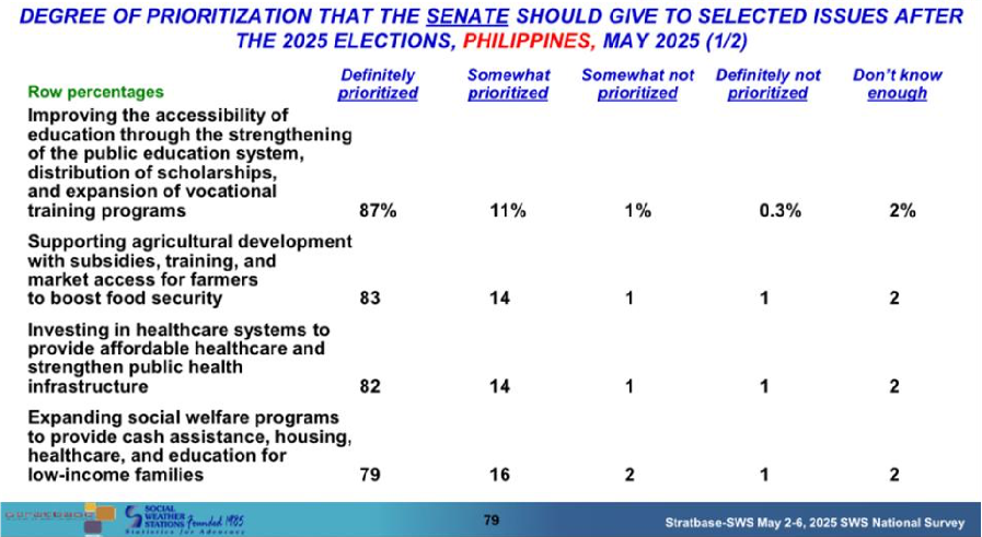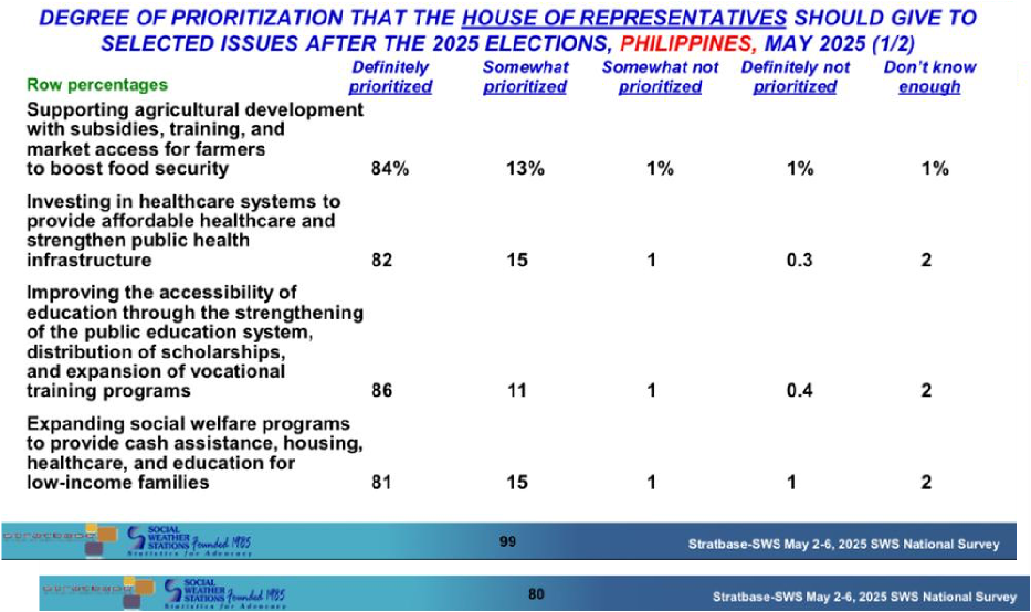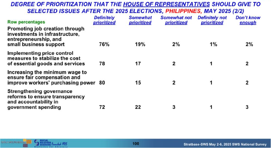 As the country moves forward from the 2025 midterm elections, a survey conducted from May 2 to 6, 2025 with 1,800 registered voters conducted by the Social Weather Stations (SWS) in partnership with the Stratbase Group, revealed what Filipinos expect from their incumbent and newly-elected leaders: a clear commitment to transparency and accountability was a top mandate from the people and also a strong focus on jobs, healthcare, education, infrastructure, and food security.