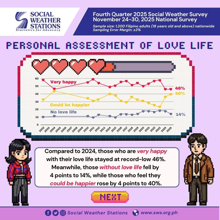 The national Social Weather Survey of November 24-30, 2025 found a record-low 46% of adult Filipinos saying they were very happy with their love life, 40% saying they could be happier, and 14% saying they have no love life.