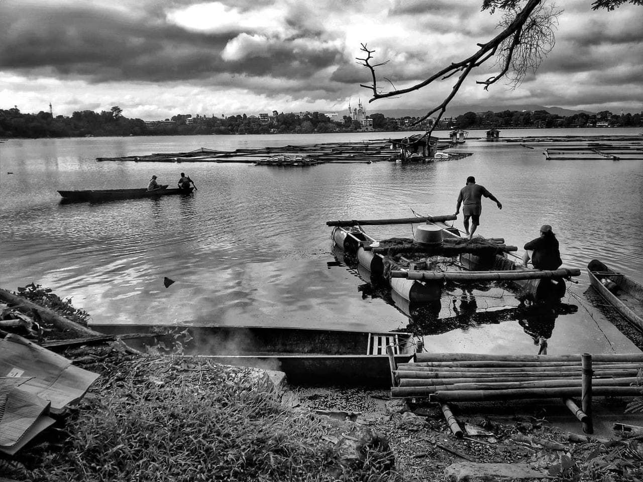 And bamboo rafts, the lake gleaming