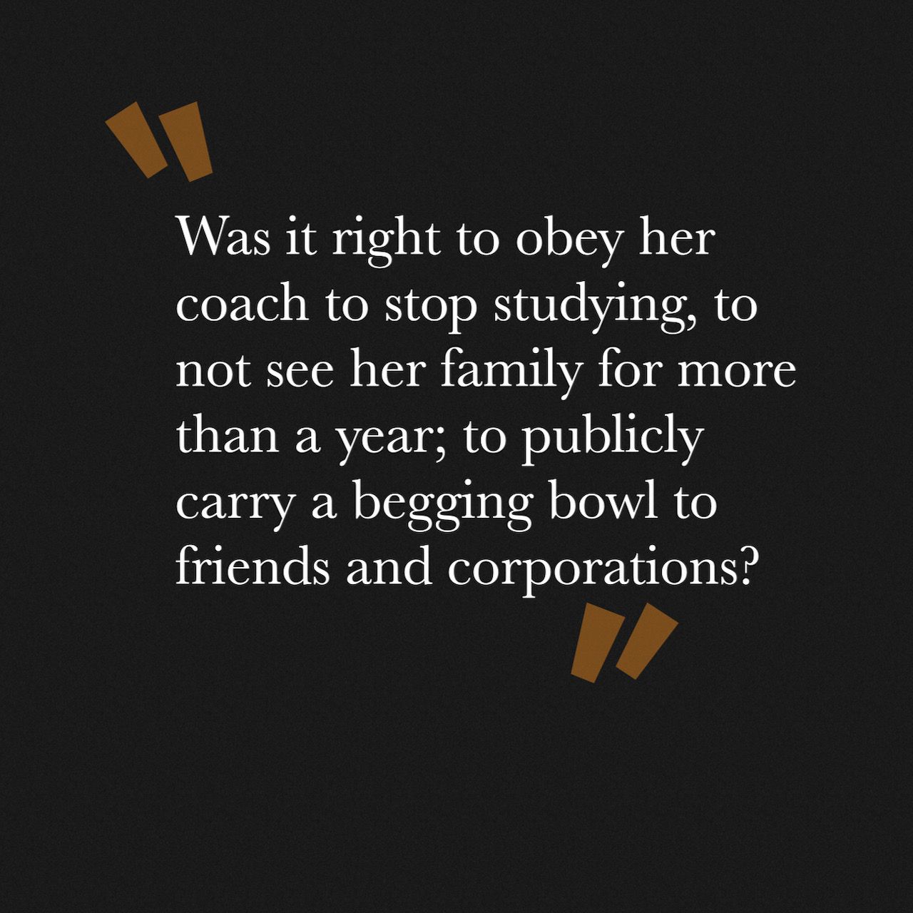 In those few seconds, all concerns and doubts end, right or wrong: the anxiety of where to stay, where to train; the need to prove that she was right to obey her coach to stop studying, to not see her family for more than a year; to carry a begging bowl to friends and corporations so publicly.
