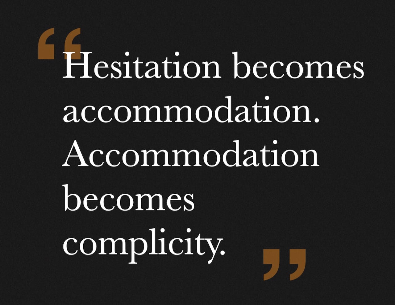 Hesitation becomes accommodation. Accommodation becomes complicity.