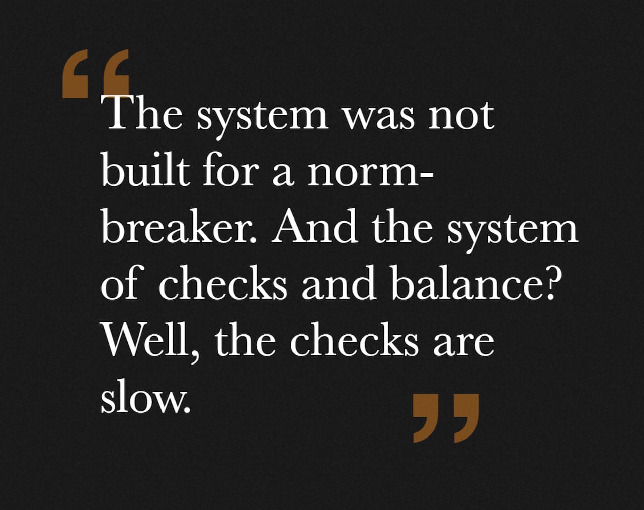 The system was not built for a norm-breaker who holds legitimate power. Every check assumed the man at the top would observe unwritten rules. And the system of checks and balance? Well, the checks are slow.