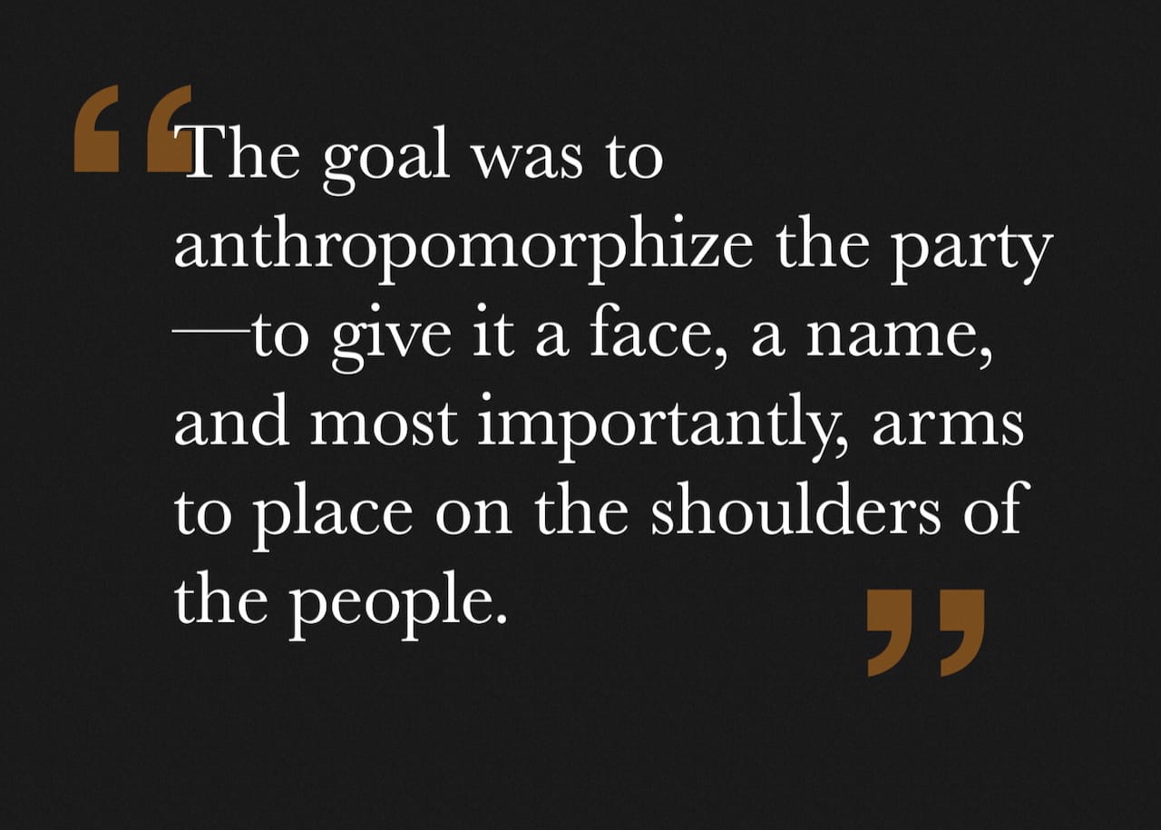 The goal was to anthropomorphize the party—to give it a face, a name, and most importantly, arms to place on the shoulders of the people.