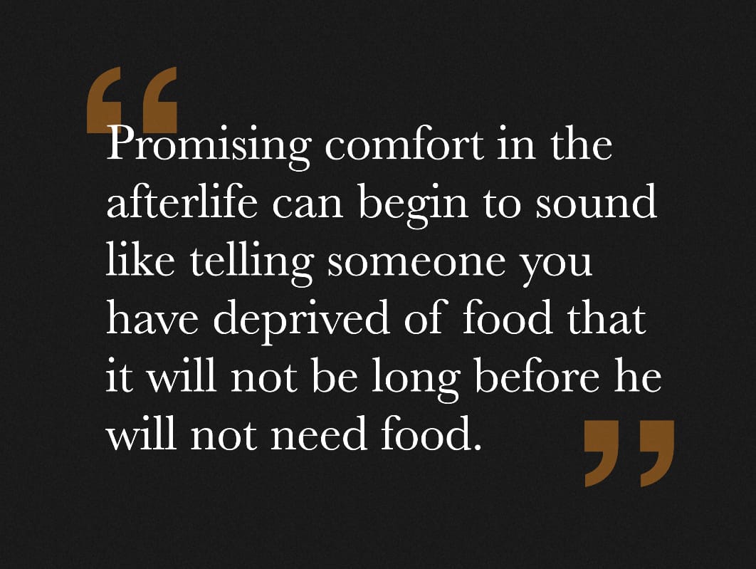 We live in a grieving, hungry, hope-deprived world. And promising comfort in the afterlife can begin to sound like telling someone you have denied food that it will not be long before he will not need food.