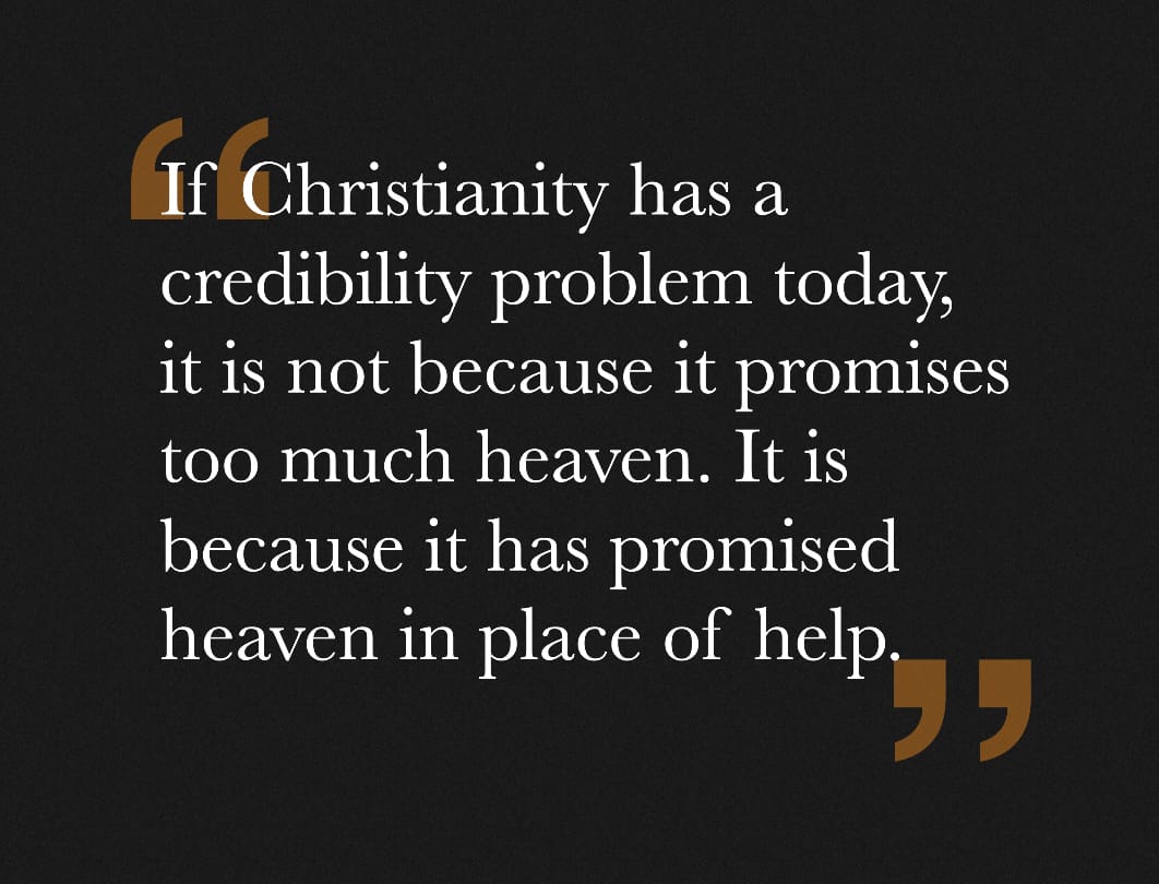 If Christianity, in the eyes of many, has a credibility problem today, it is because today's churches tend to promise heaven in place of help.