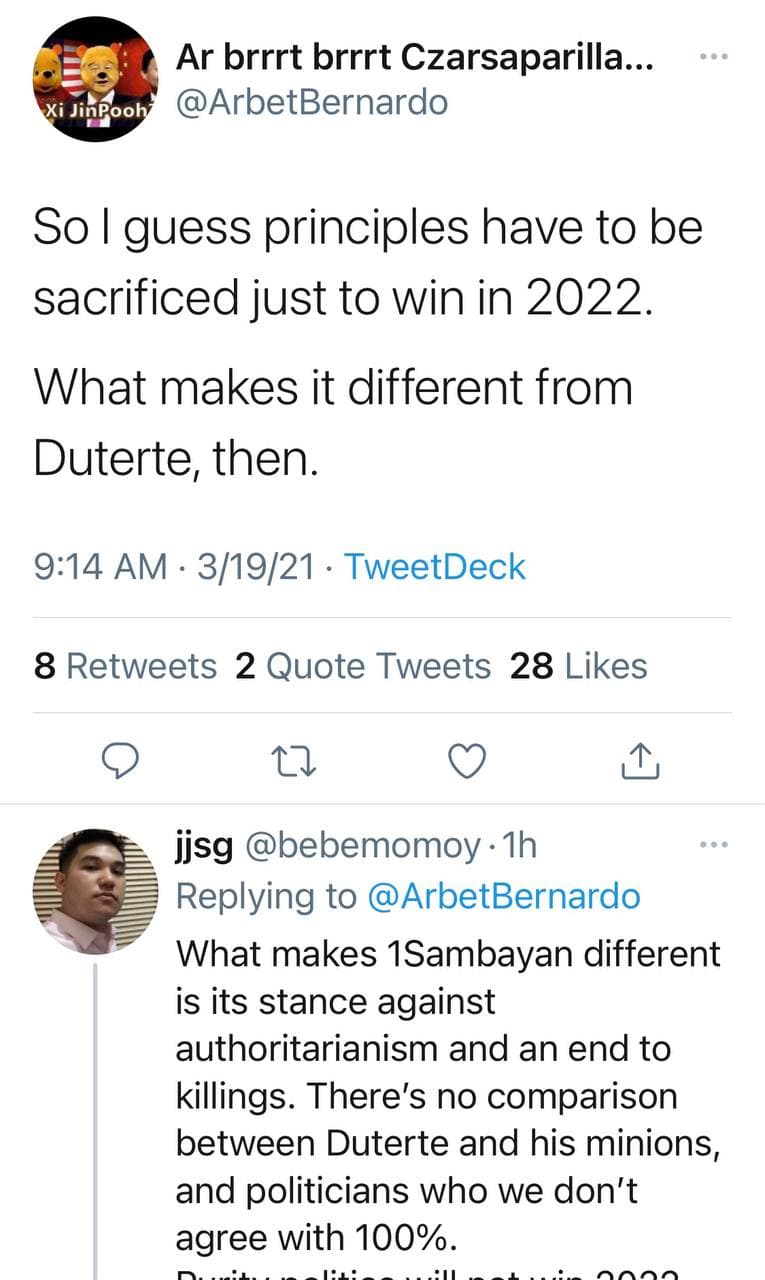 Arbert Bernando said in a tweet: “So I guess principles have to be sacrificed just to win in 2022. What makes it different from Duterte, then?”