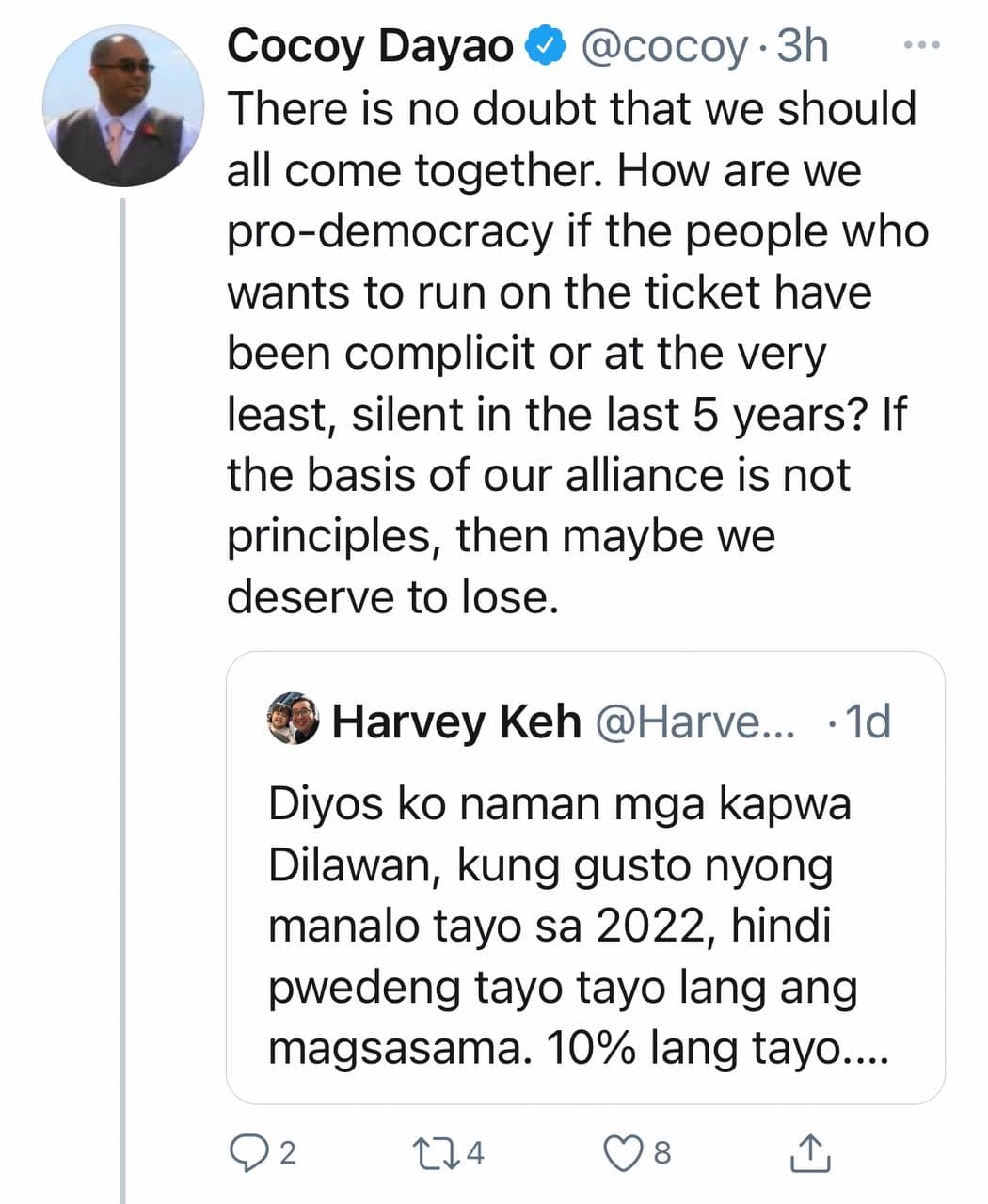 Another tweet read: “There is no doubt we should all come together. How are we pro-democracy if the people who want to run on the ticket have been complicit or at the very least, silent in the last 5 years? If the basis of our alliance is not principles, then maybe we deserve to lose.”