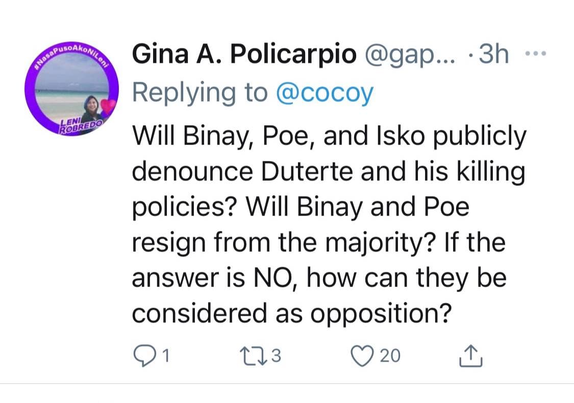 Gina A. Policarpio tweeted: “Will Binay, Poe and Isko publicly denounce Duterte and his killing policies? Will Binay and Poe resign from the majority? If the answer is NO, how can they be considered as opposition?”