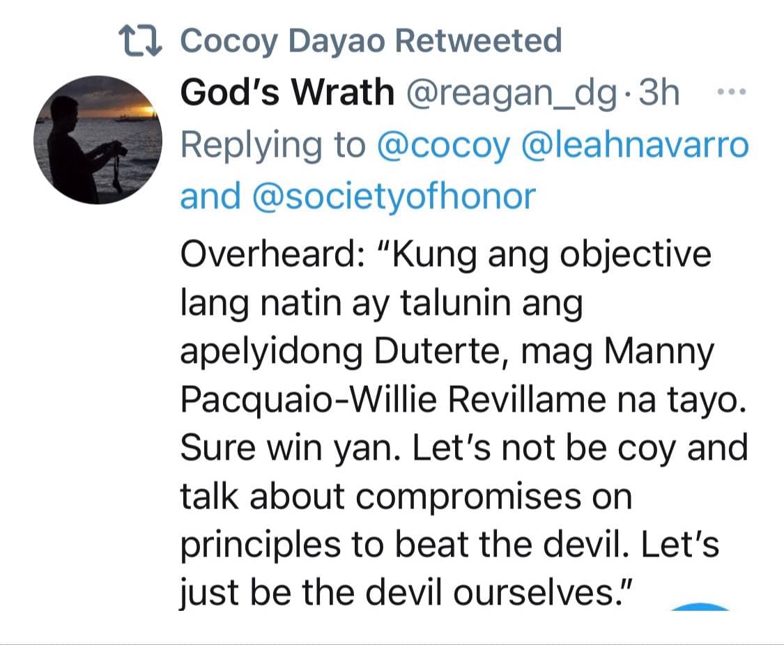 A twitter user with the handle God’s Wrath said: “Overheard: Kung ang objective lang natin ay talunin si Duterte, mag-Manny Pacquiao-Willie Revillame na lang tayo. Sure win yan. Let’s not be coy and talk about compromises on principles to beat the devil. Let’s just be the devil ourselves.”