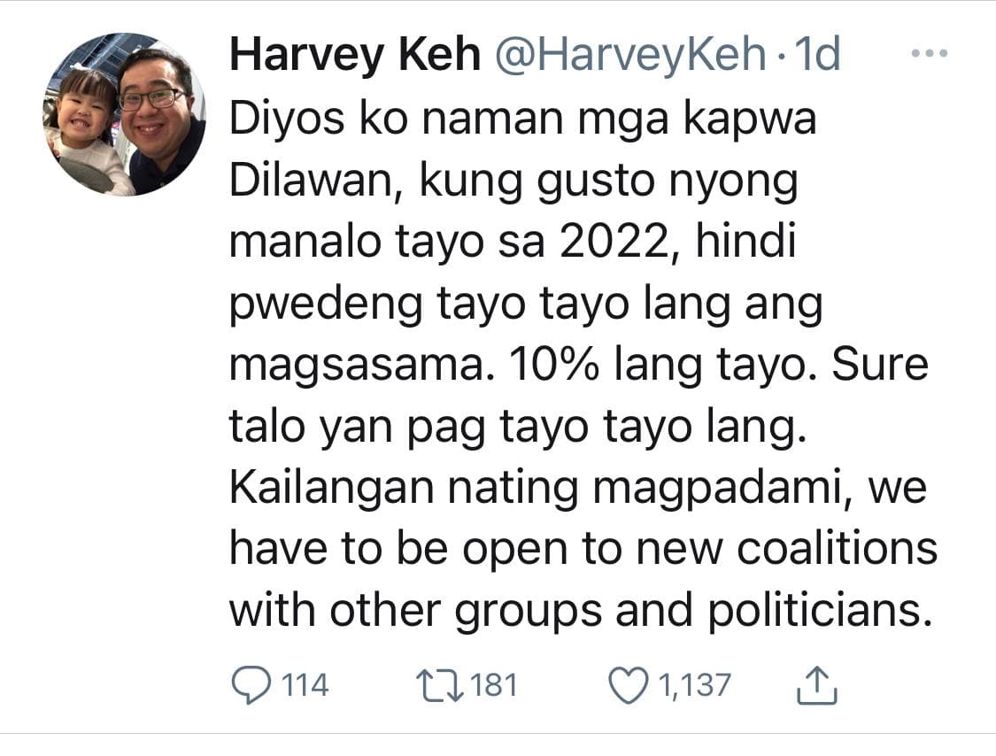 “Diyos ko naman mga kapwa Dilawan, kung gusto nyong manalo tayo sa 2022, hindi pwedeng tayo tayo lang ang magsasama. 10% lang tayo…”